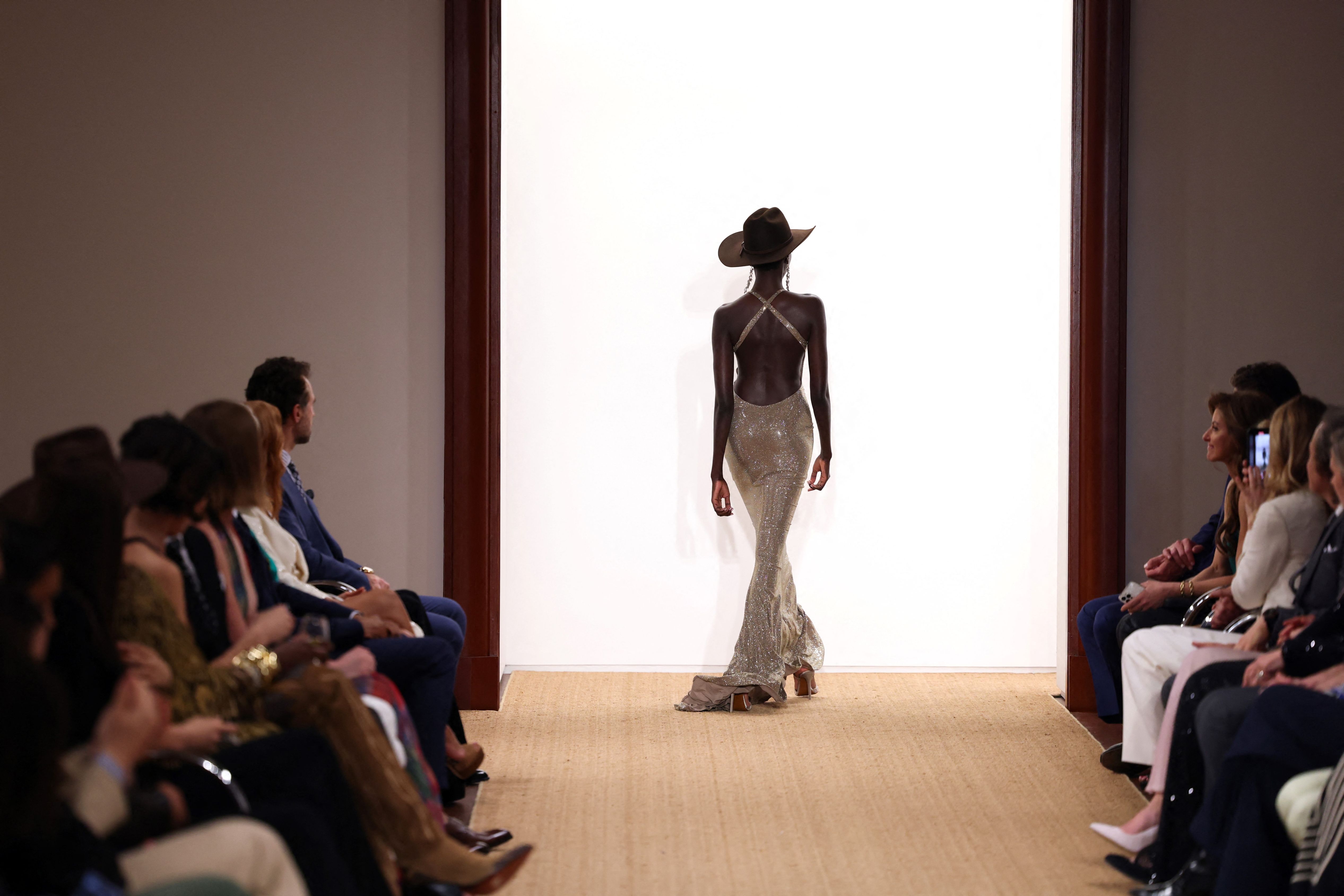 A model walks the runway during the Ralph Lauren Fall/Holiday fashion show in New York City on April 29, 2024. (Photo by Charly Triballeau/AFP Photo)