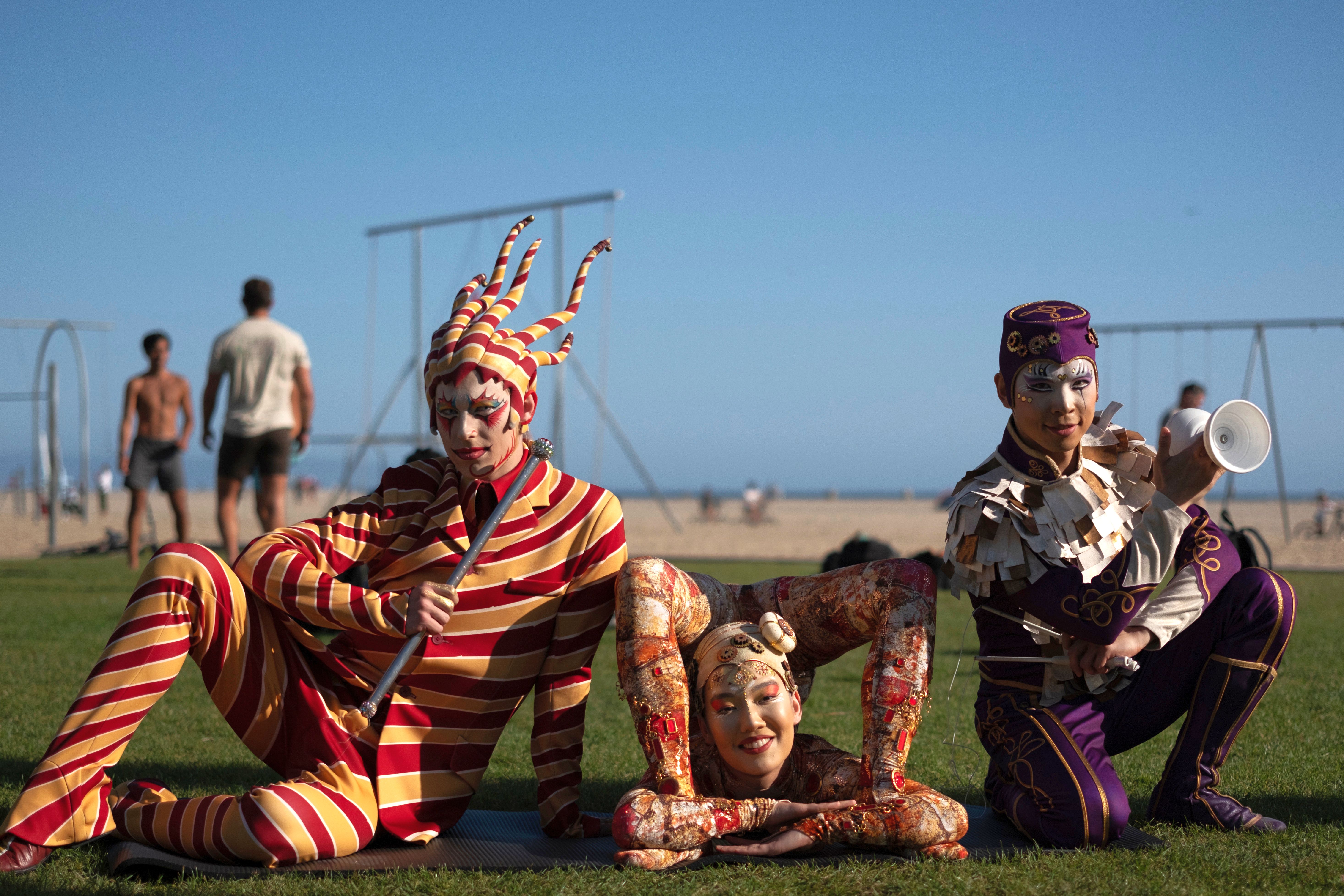 Cirque du Soleil performer Mitch Wynter, known as the, Trickster, left, is joined by contortionist Sender Enkhtur, center, and Wei-Liang Lin at Santa Monica Beach as they pose for photos, Monday, April 29, 2024, in Santa Monica, Calif. Cirque du Soleil announced their return to the Santa Monica Pier this fall after being gone for over a decade. (Photo by Richard Vogel/AP Photo)