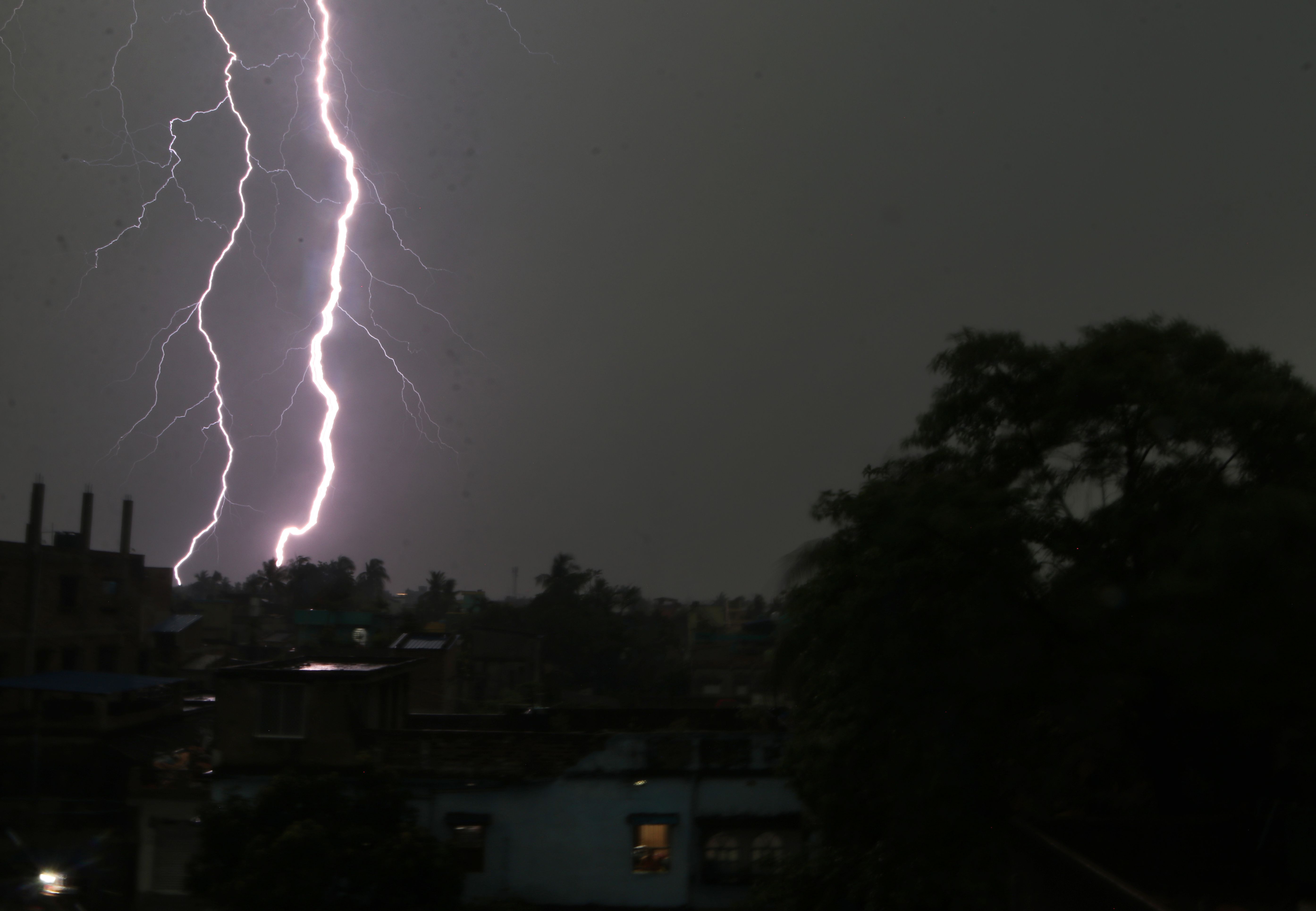 This photograph taken on April 27, 2023 shows a lightning strike near the resident balling during a thunderstorm over the city of Kolkata in India. (Photo by Debajyoti Chakraborty/NurPhoto)