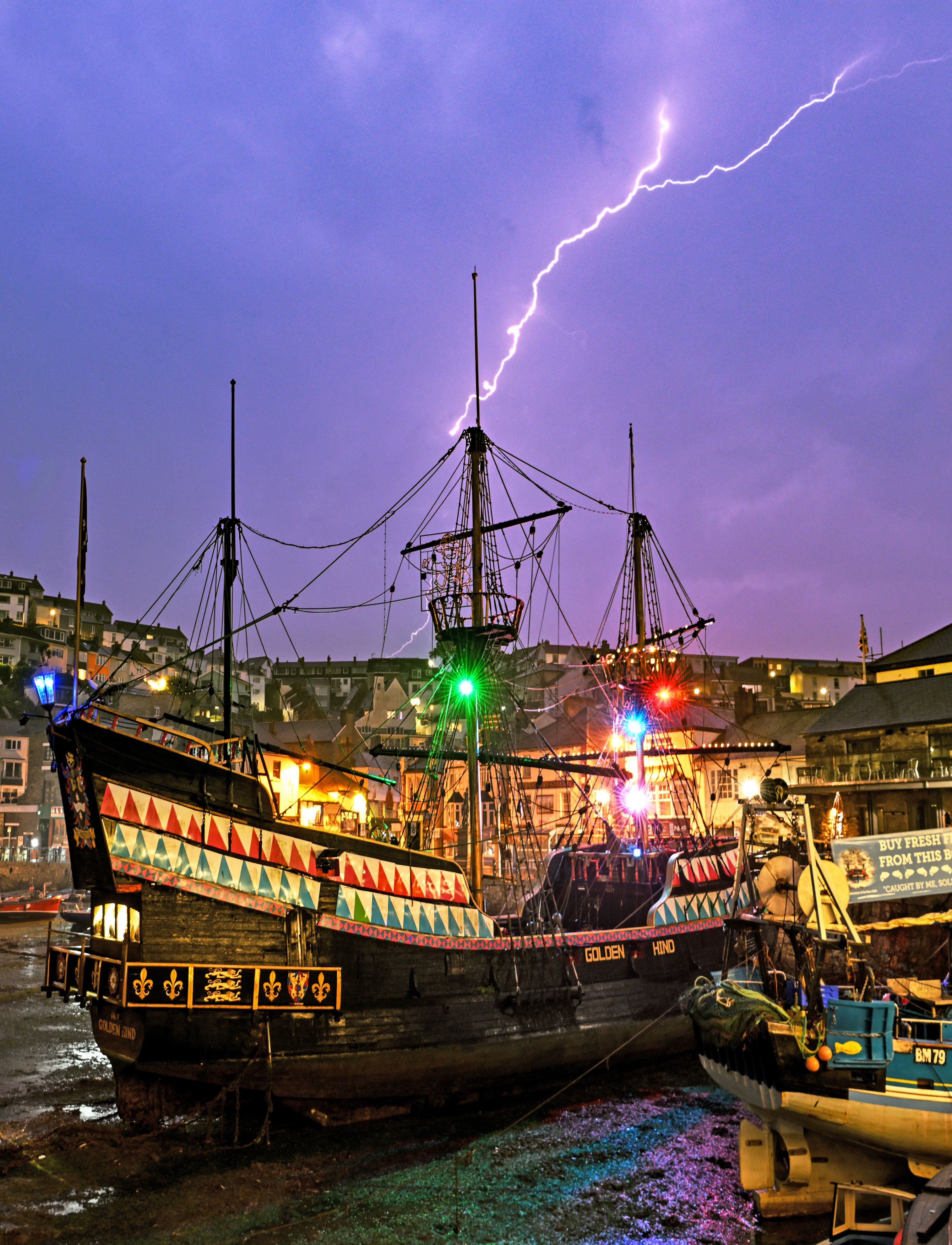 A bolt of lightning stikes over the Golden Hind ship in Brixham Harbour, United Kingdom on September 17, 2023. (Photo by Chris Slack/Animal News Agency)