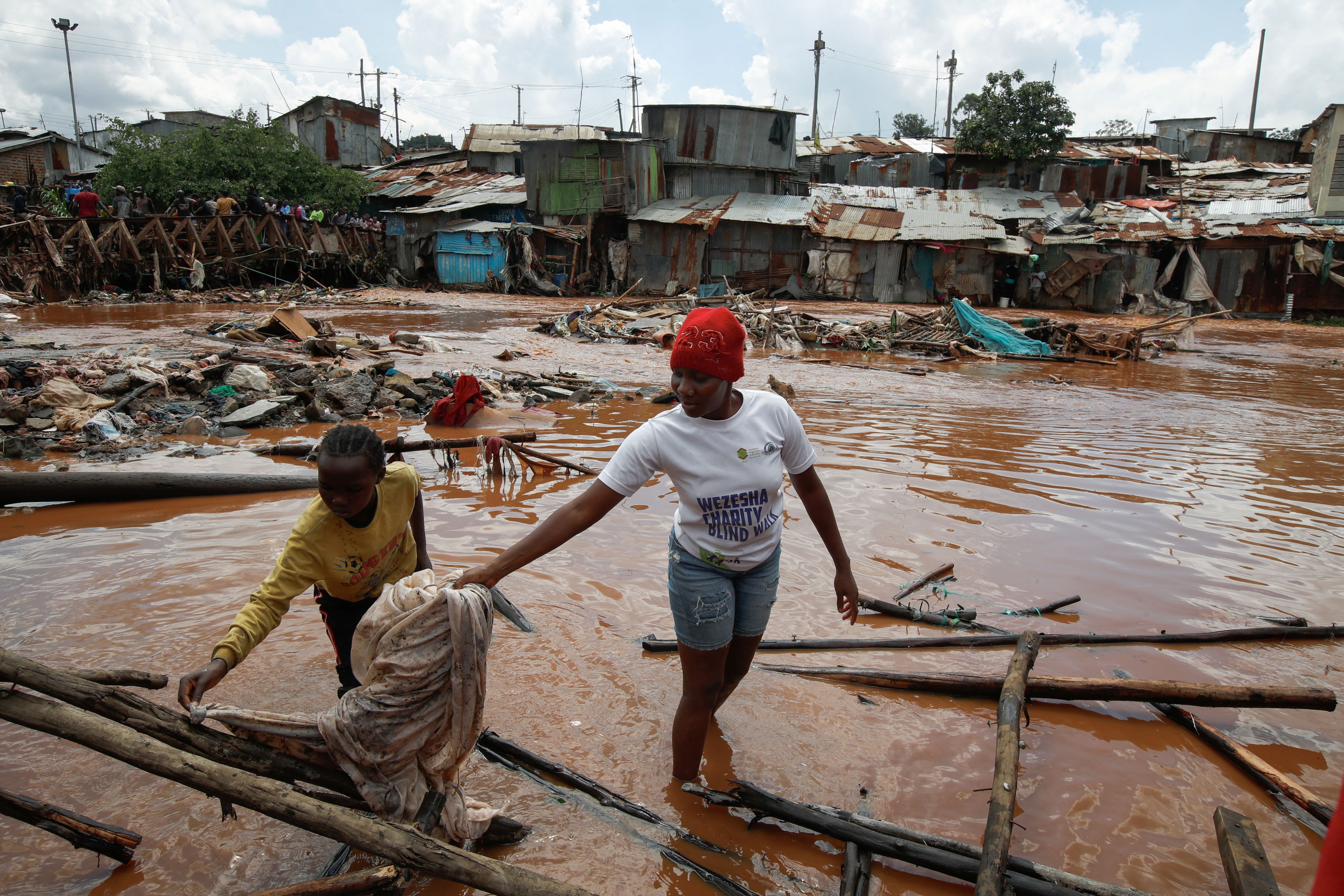 Residents wade through flood waters after the Nairobi river burst its banks and destroyed their homes within the Mathare valley settlement in Nairobi, Kenya on April 24, 2024. (Photo by Monicah Mwangi/Reuters)