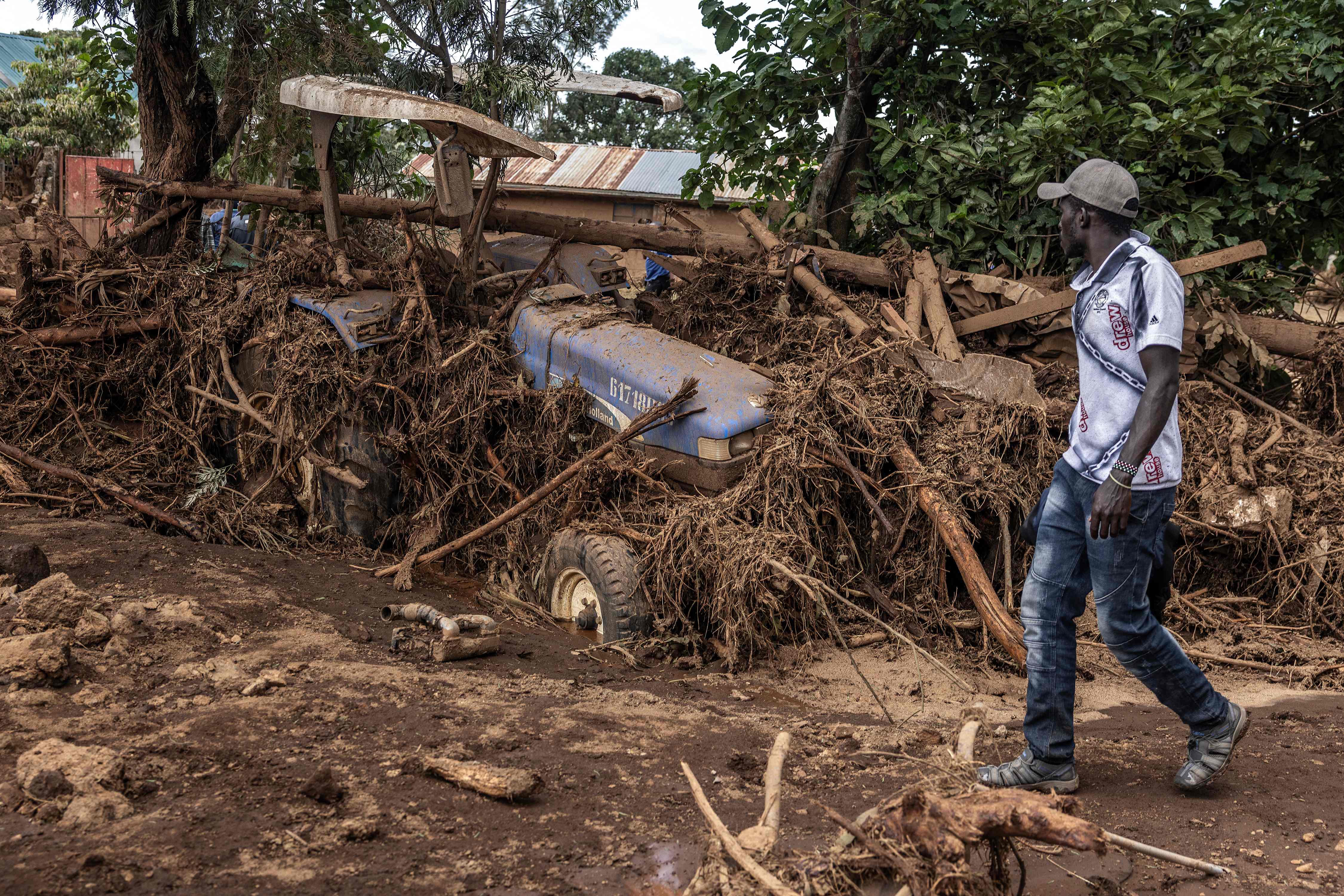 A man walks next to a damaged tractor carried by waters in an area heavily affected by torrential rains and flash floods in the village of Kamuchiri, near Mai Mahiu, on April 29, 2024. At least 45 people died when a dam burst its banks near a town in Kenya's Rift Valley, police said on April 29, 2024, as torrential rains and floods battered the country. The disaster raises the total death toll over the March-May wet season in Kenya to more than 120 as heavier than usual rainfall pounds East Africa, compounded by the El Nino weather pattern. (Photo by Luis Tato/AFP Photo)