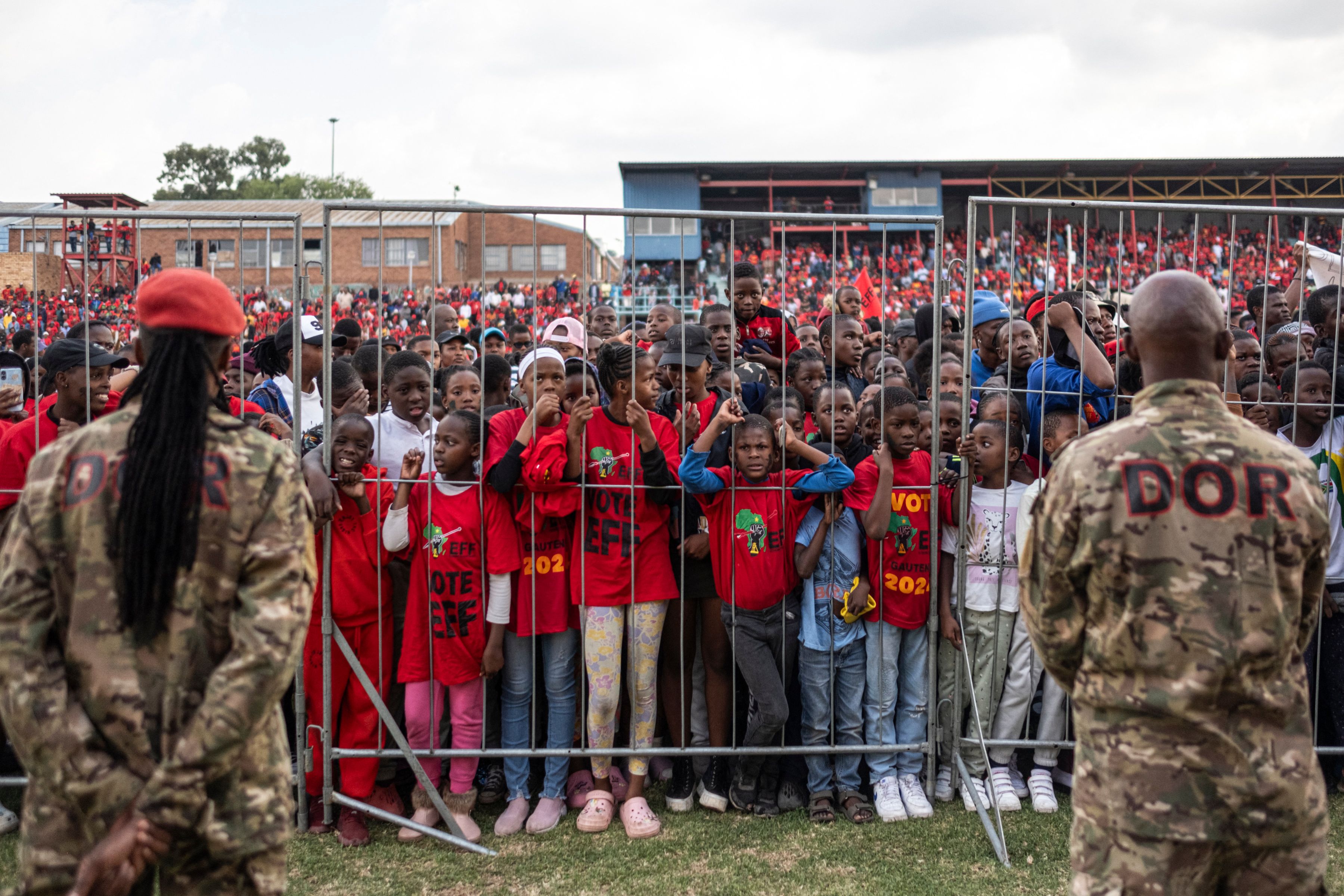 Supporters of opposition party, the Economic Freedom Fighters (EFF), gather during a campaign rally in Alexandra near Johannesburg, on April 27, 2024. (Photo by Emmanuel Croset/AFP Photo)