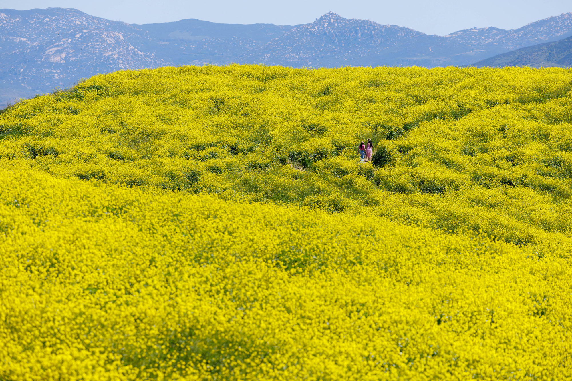 People walk through rolling hills of wildflowers following a wet and rainy winter in Chula Vista, California, U.S., April 2, 2024. (Photo by Mike Blake/Reuters)
