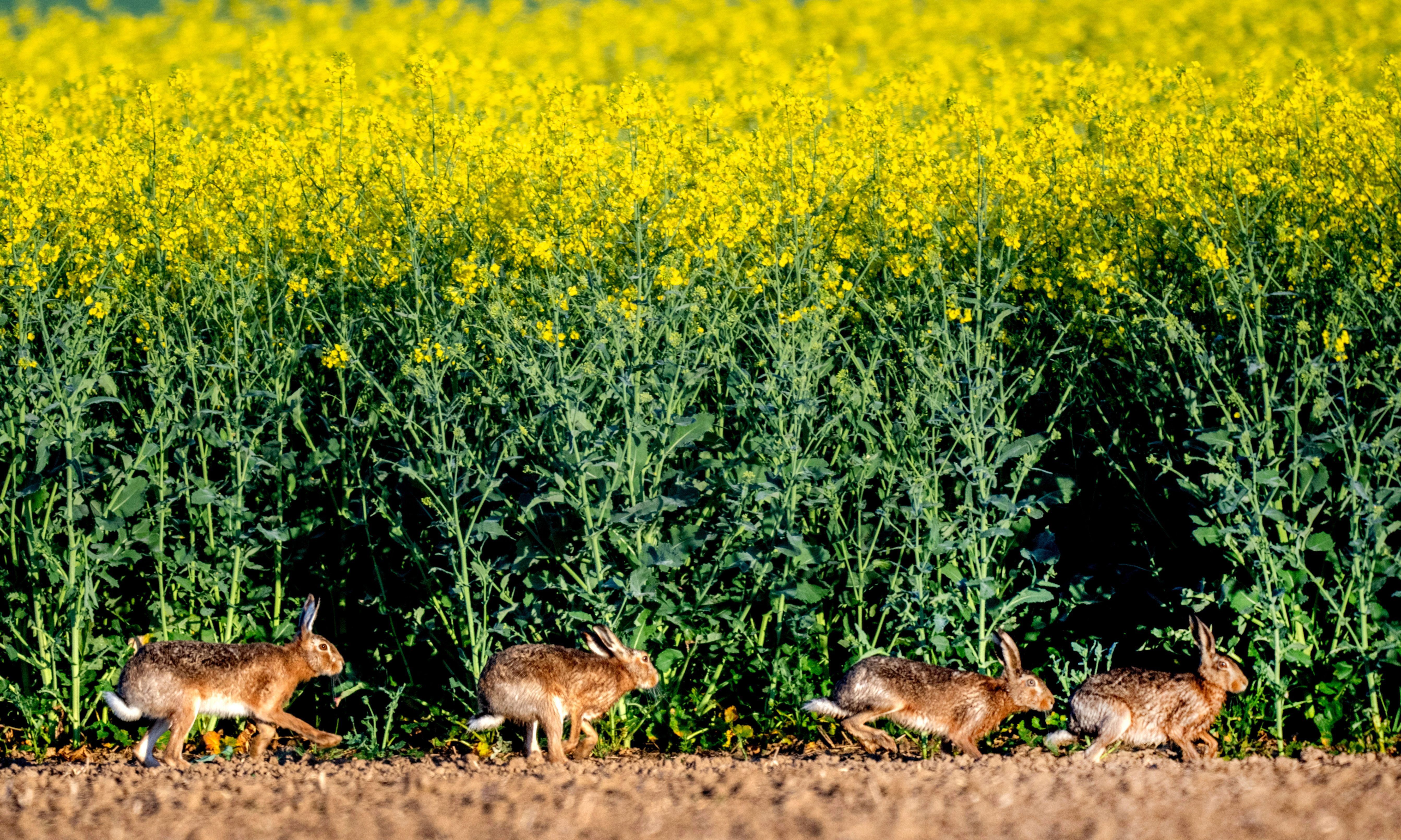 Hares run along a rape field in the outskirts of Frankfurt, Germany, early Thursday, April 11, 2024. (Photo by Michael Probst/AP Photo)