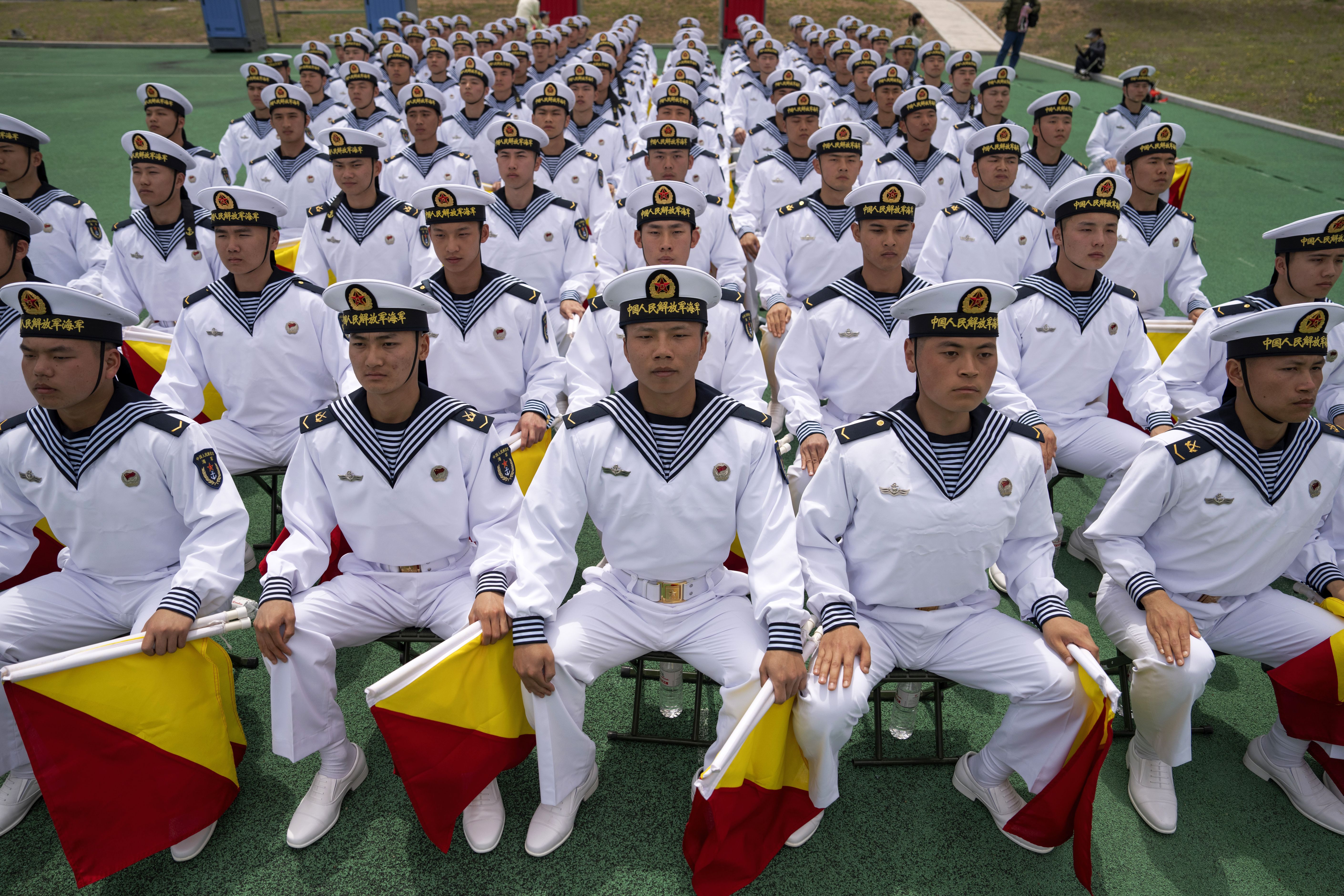 Chinese sailors holding flags used for signaling during a tour arranged for foreign journalists, a day before the opening of the West Pacific Naval Symposium in Qingdao in eastern China's Shandong province, Sunday, April 21, 2024. Established in 1953, the Academy has trained more than 100,000 naval officers and sailors for the Chinese navy and over 80 percent of submarine staff graduate or were trained here, according to China's official People's Daily. (Photo by Ng Han Guan/AP Photo)