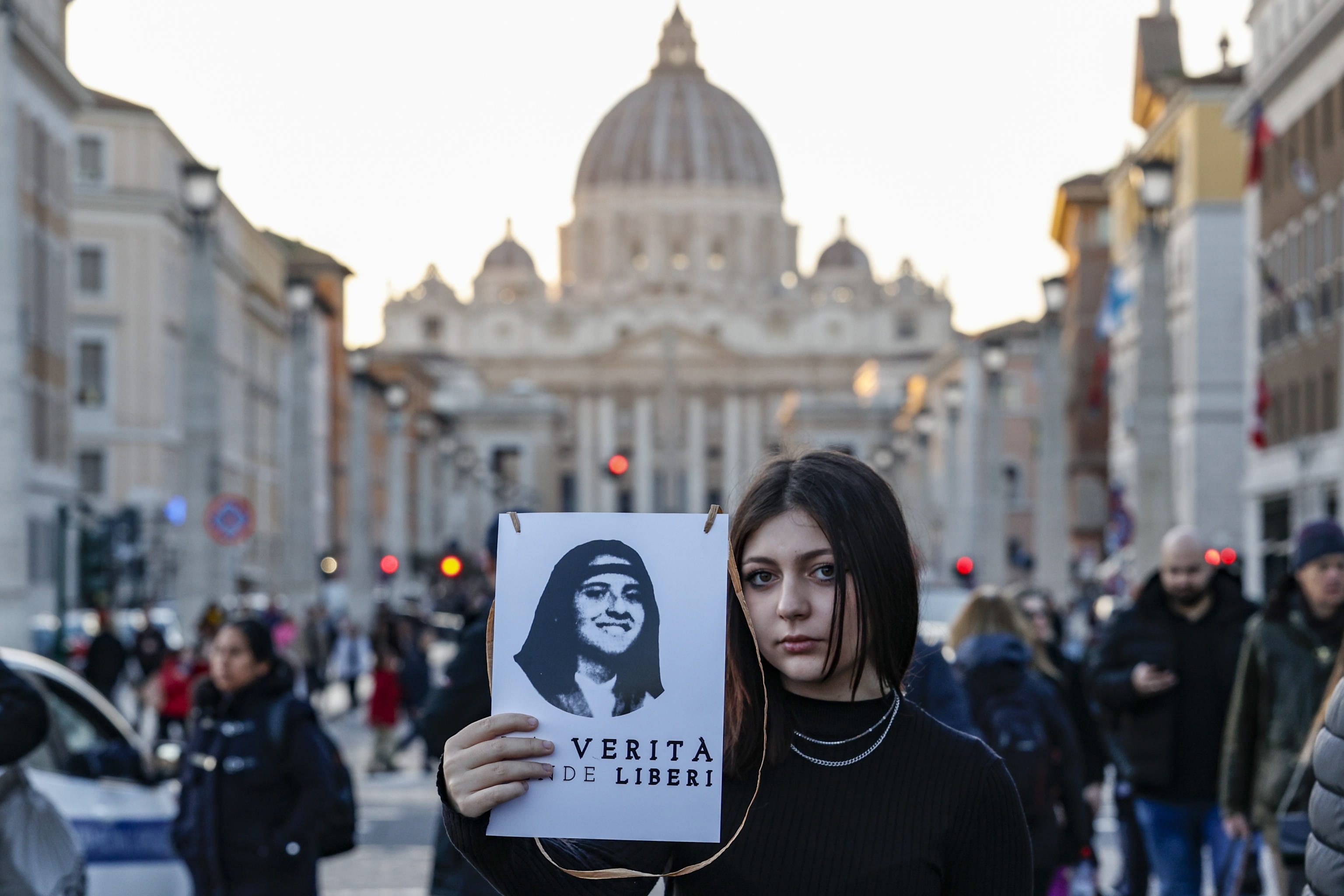 A woman holds a placard showing Emanuela Orlandi, a Vatican teenager who disappeared in 1983 aged 15, as she takes part in a rally along Via della Conciliazione near Vatican City, in Rome, Italy, 14 January 2023. Orlandi's disappearance is one of Italy's most notorious unsolved mysteries. The Vatican on 09 January 2023 reopened the investigation into Orlandi's disappearance. (Photo by Fabio Frustaci/EPA/EFE)