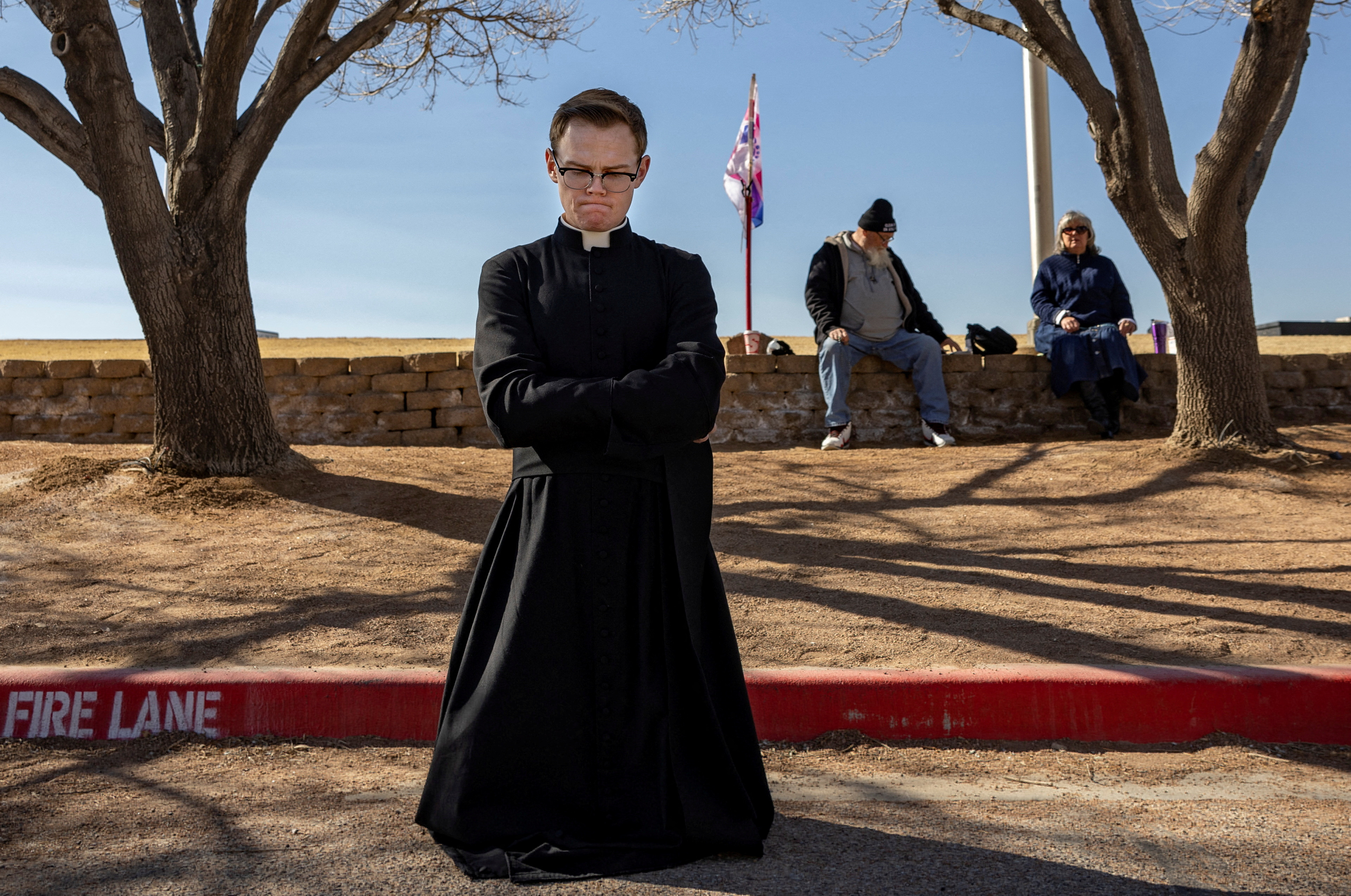 A priest in training protests abortion outside the Women's Reproductive Clinic of New Mexico, in Santa Teresa, U.S., January 13, 2023. The abortion clinic, just over the border with Texas, where abortion is illegal since Roe v. Wade was overturned, provides medical abortions for women who are flying and driving hundreds of miles across Texas. (Photo by Evelyn Hockstein/Reuters)