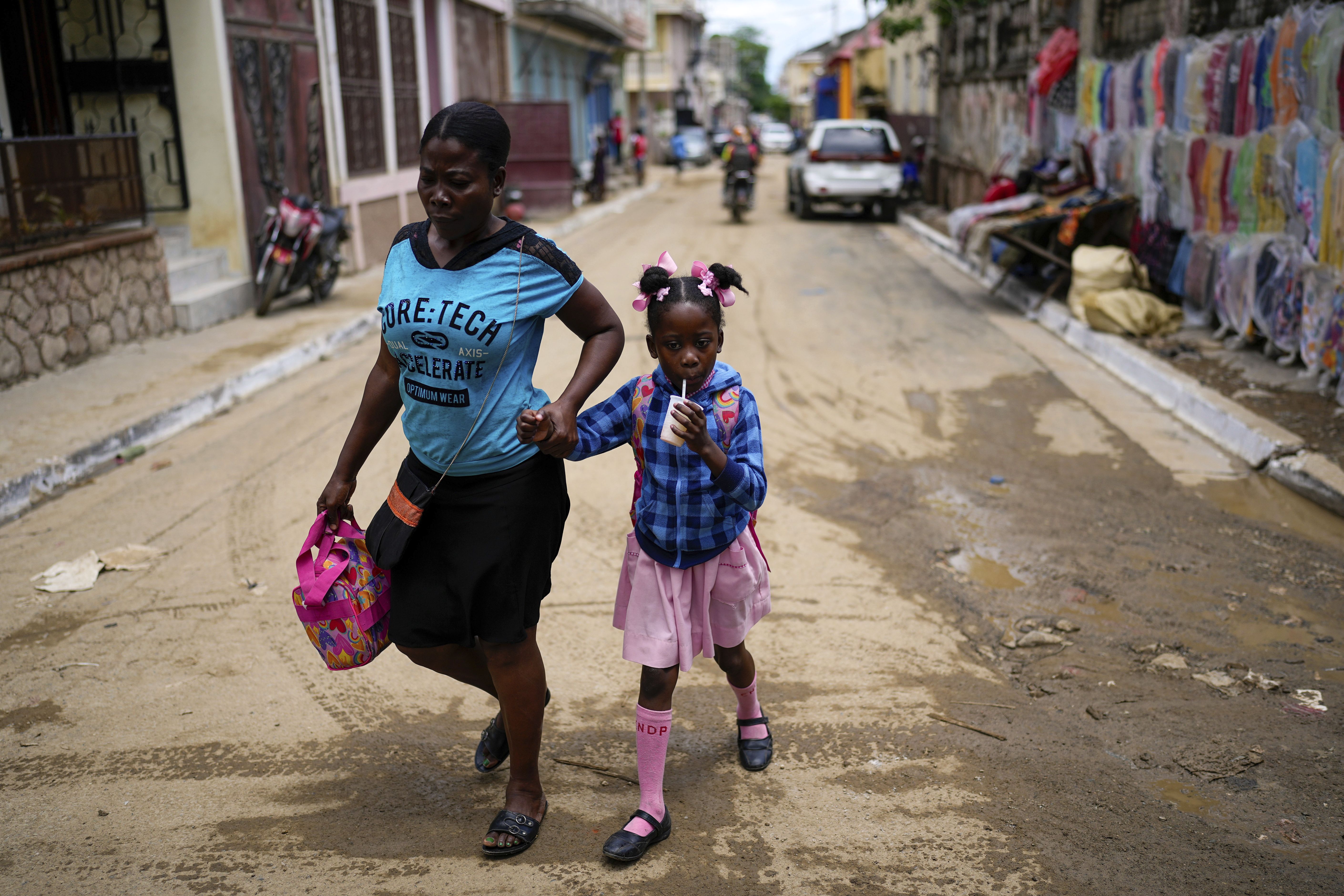 A child sips on a drink after she was picked up from school, in Cap-Haitien, Haiti, April 17, 2024. (Photo by Ramon Espinosa/AP Photo)