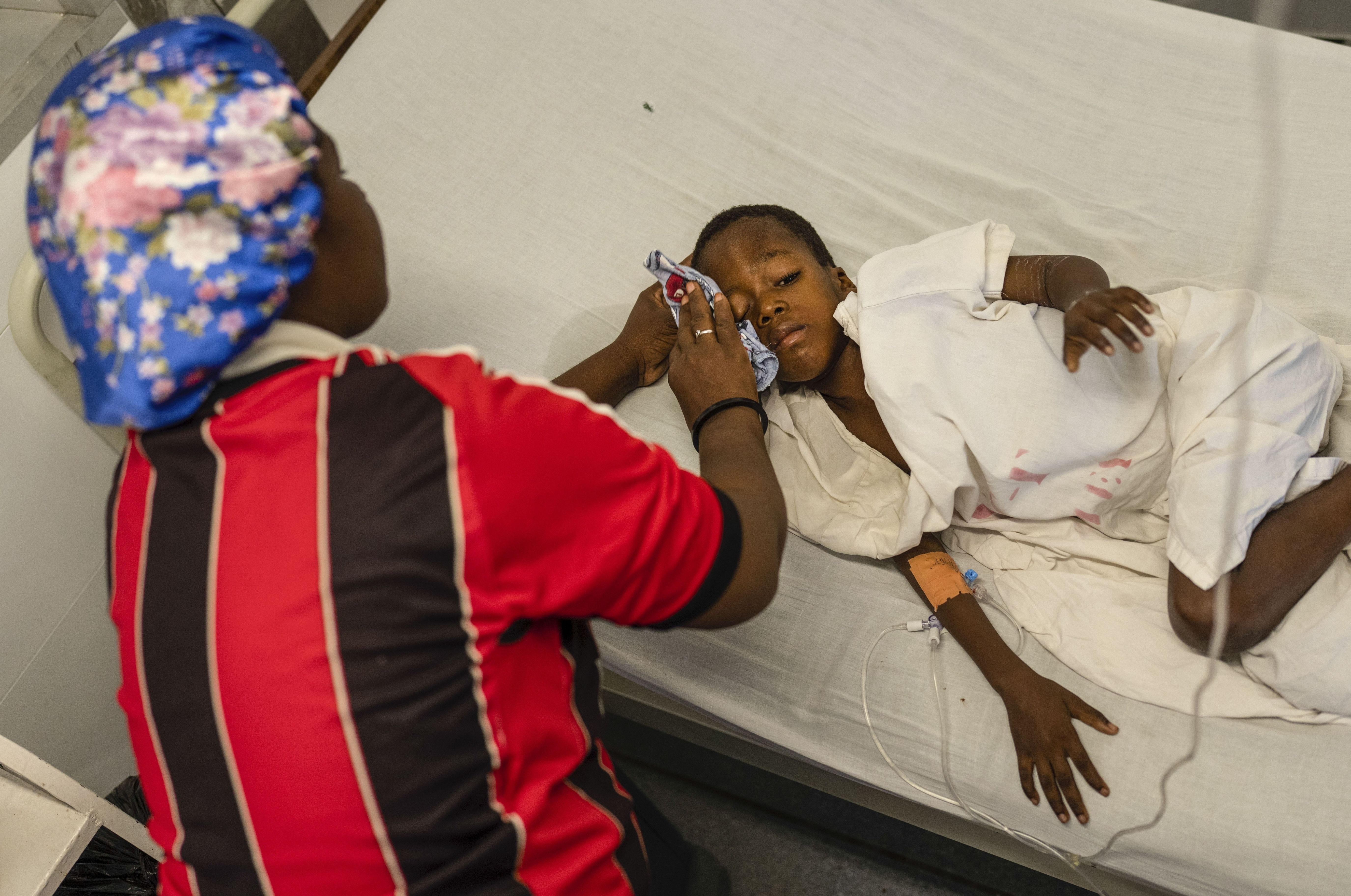 Denize Flerino wipes sweat from the brow of her son who is suffering from high fevers at a Doctors Without Borders emergency room in the Cite Soleil neighborhood of Port-au-Prince, Haiti, April 19, 2024. (Photo by Ramon Espinosa/AP Photo)
