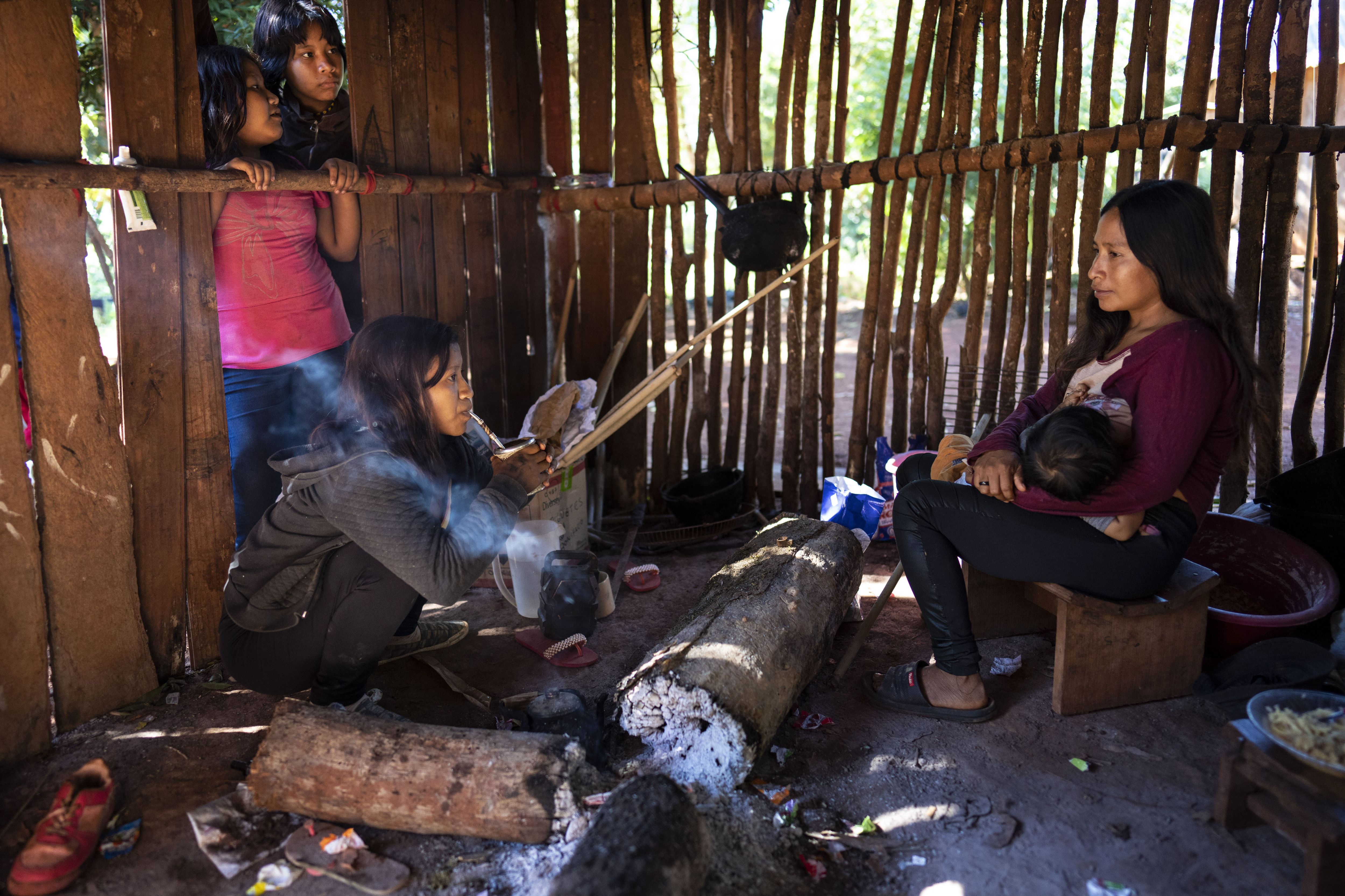 Margarita Mendez, front left, drinks mate as her friend Cristina Chamorro breastfeeds in an outdoor kitchen in the Guaraní Indigenous community of Kaaguy Pora II, on the outskirts of Andresito, in Argentina's Misiones Province, the center of the world's maté production, April 18, 2024. (Photo by Rodrigo Abd/AP Photo)
