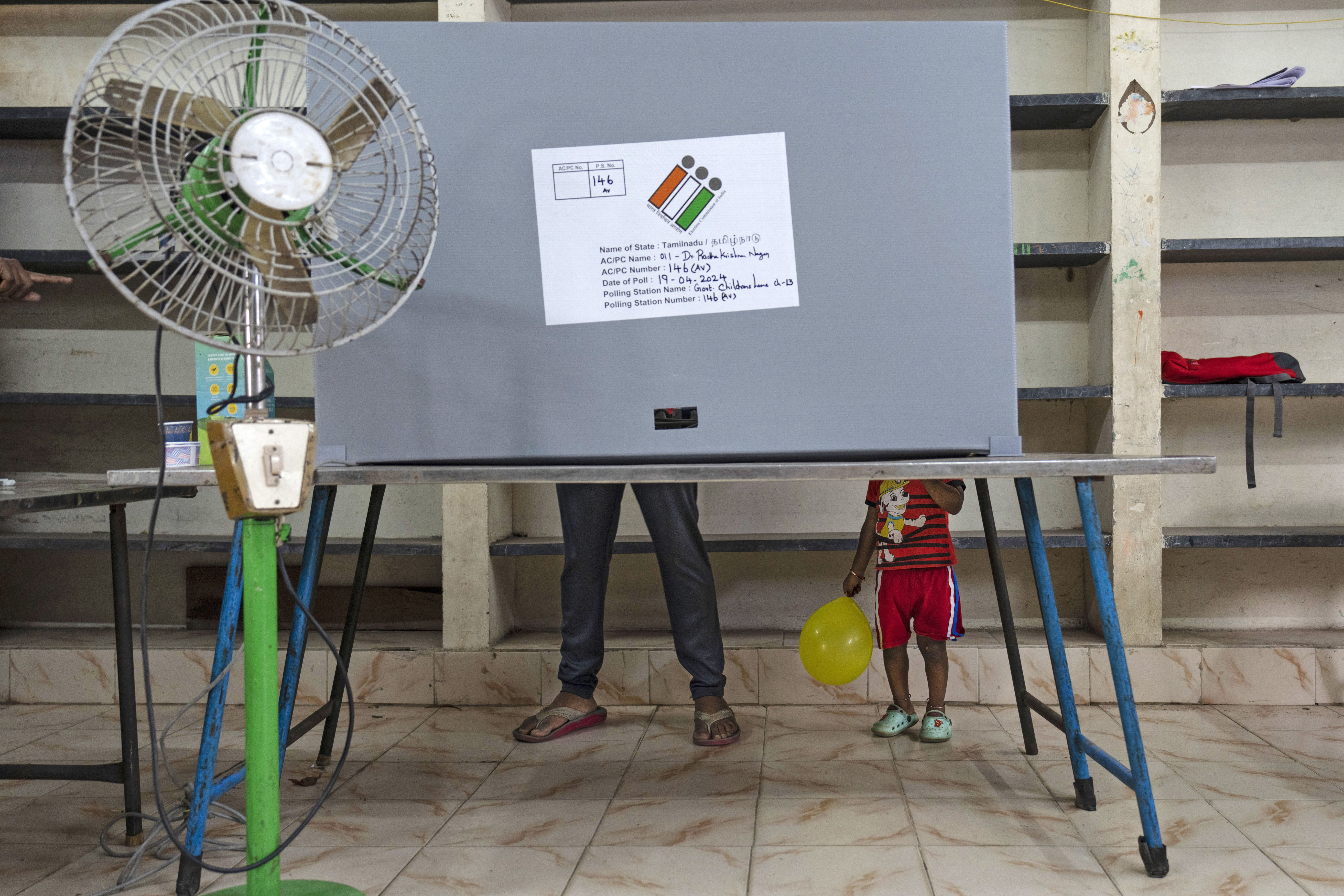 A child holding a balloon stands next to an adult casting his vote at a polling station during the first round of a national election, in Chennai, India, April 19, 2024. (Photo by Altaf Qadri/AP Photo)