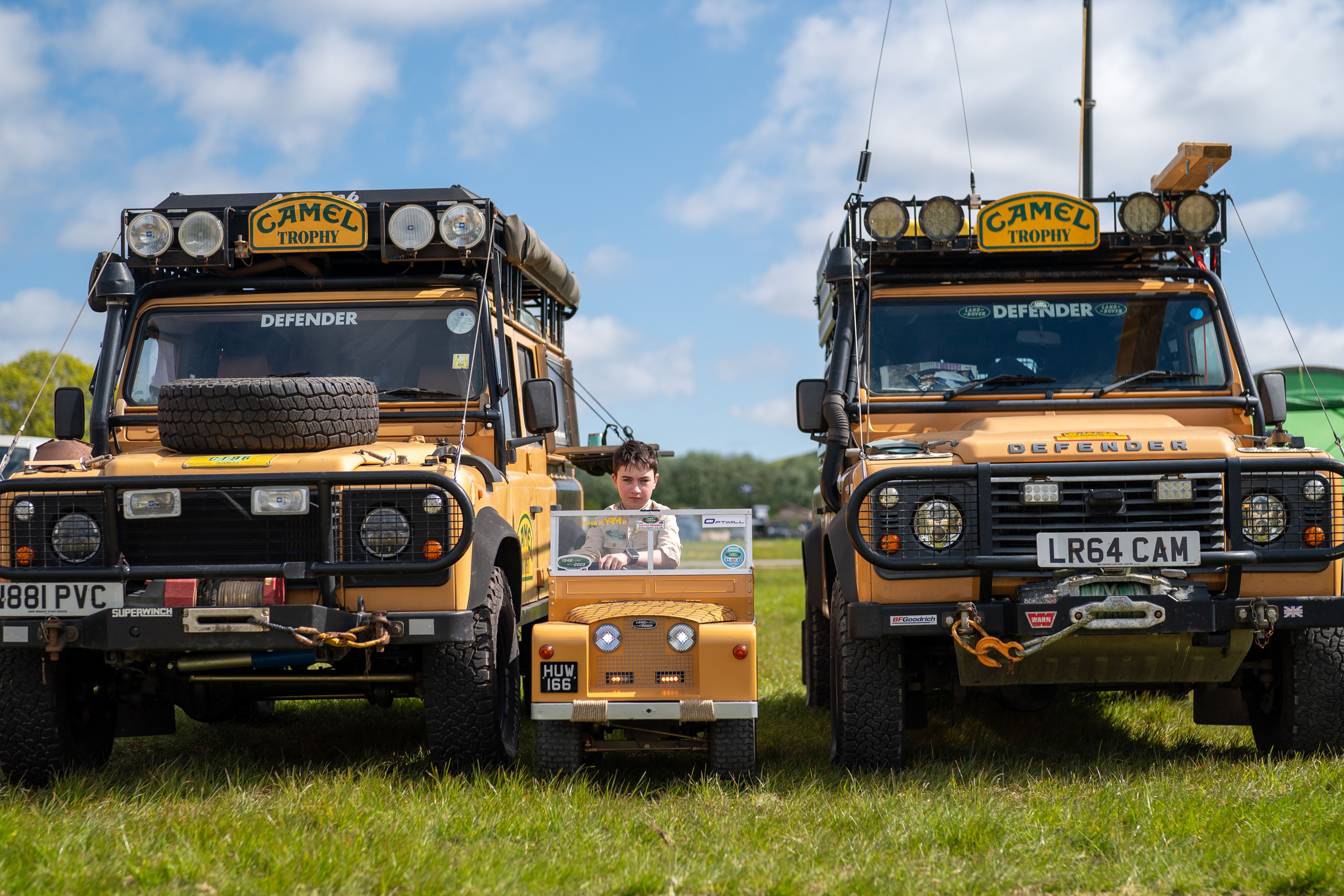 Huw Williams, 10, drives a modified electric mobility scooter, converted into a mini mk2 Land Rover, in the Camel Trophy colours, as he passes between two full size Defenders in the same livery, during the Great British Land Rover Show at the Bath & West Showground, Shepton Mallet, UK on Sunday, April 21, 2024. (Photo by Ben Birchall/PA Images via Getty Images)