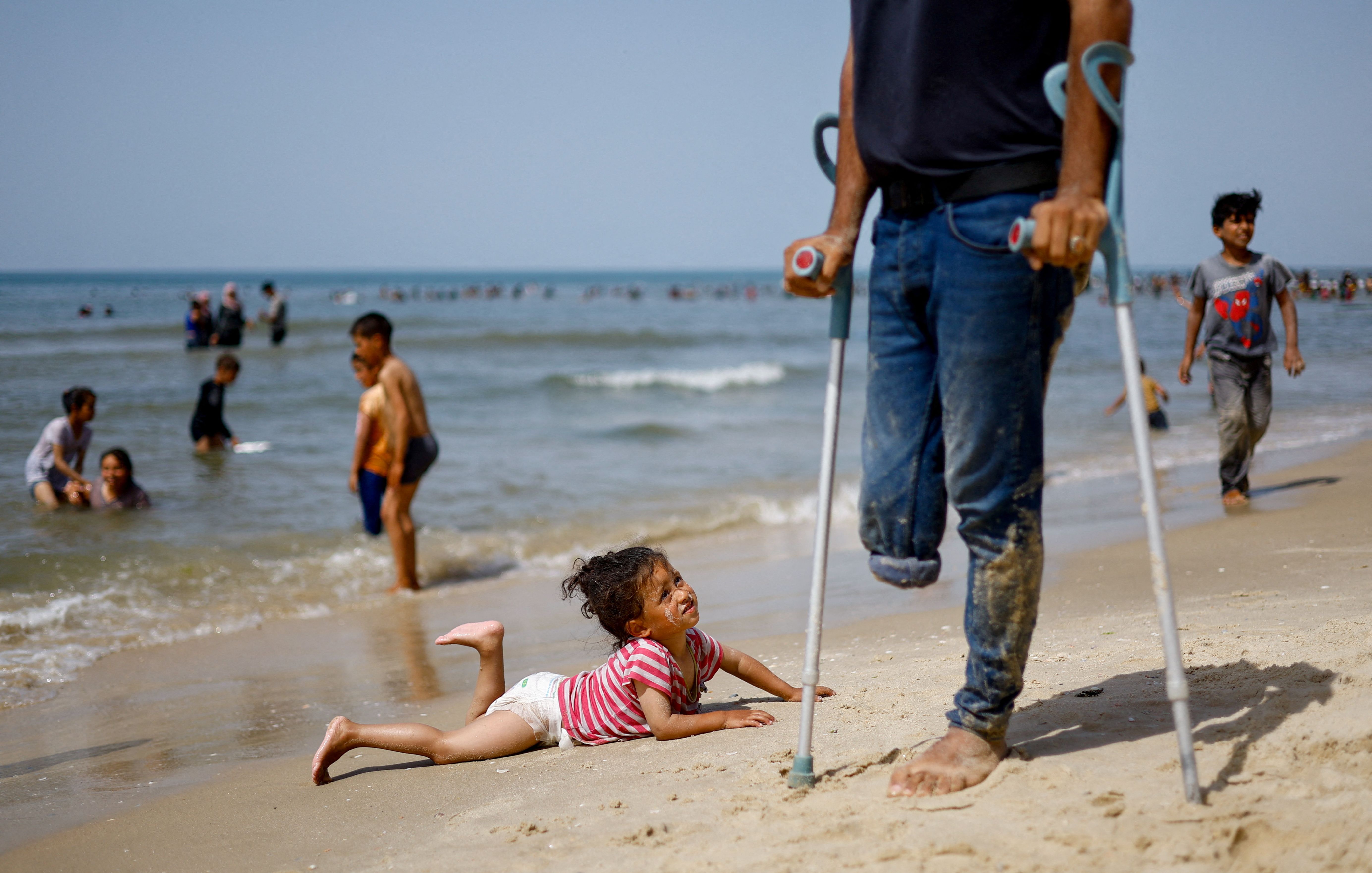 A child looks on as Palestinians enjoy the beach on a hot day, amid the ongoing conflict between Israel and Hamas, in Rafah, in the southern Gaza Strip, on April 24, 2024. (Photo by Mohammed Salem/Reuters)
