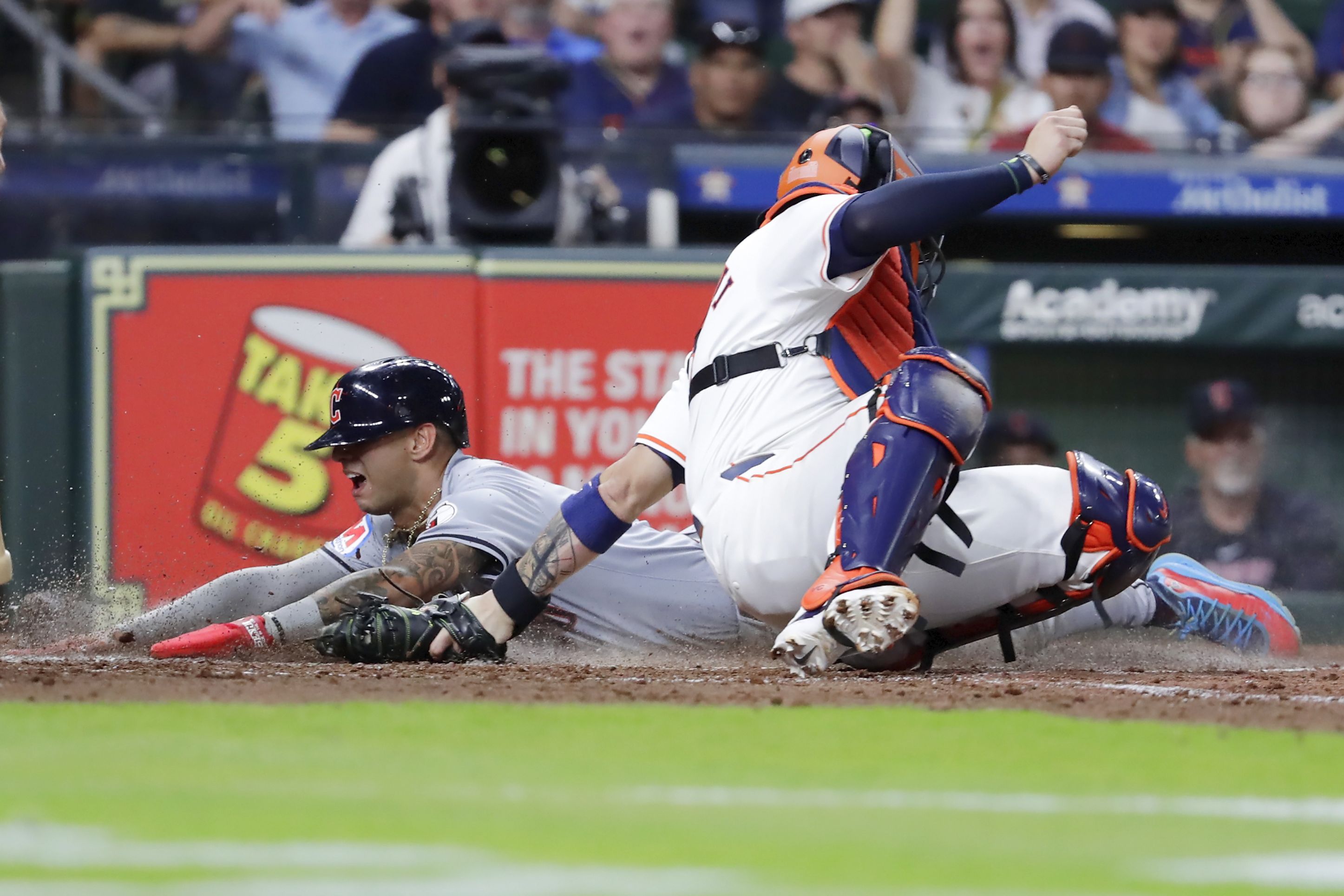 Cleveland Guardians' Brayan Rocchio, left, is safe on his slide into home plate on the RBI triple by Steven Kwan as Houston Astros catcher Victor Caratini, right, attempts the tag during the fifth inning of a baseball game Wednesday, May 1, 2024, in Houston. (Photo by Michael Wyke/AP Photo)