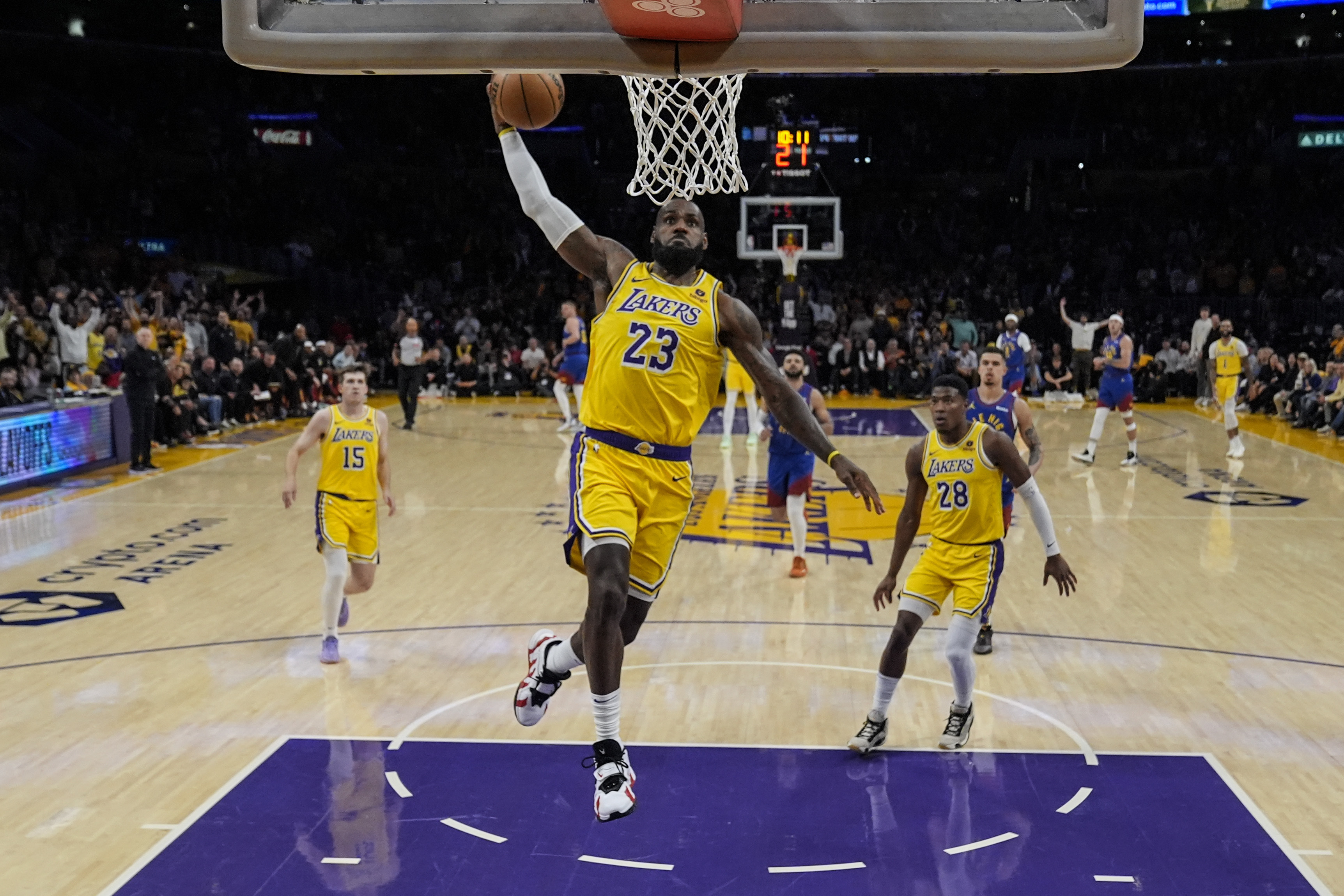 Los Angeles Lakers forward LeBron James (23) dunks during the first half of Game 3 of an NBA basketball first-round playoff series against the Denver Nuggets in Los Angeles, Thursday, April 25, 2024. (Photo by Ashley Landis/AP Photo)