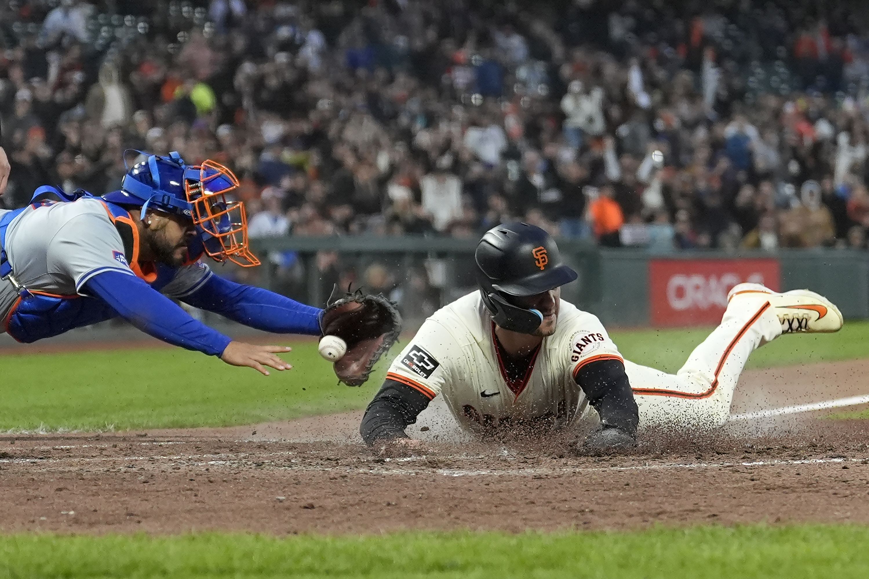 San Francisco Giants' Michael Conforto, right, slides home to score past New York Mets catcher Omar Narváez during the fifth inning of a baseball game in San Francisco, Tuesday, April 23, 2024. (Photo by Jeff Chiu/AP Photo)