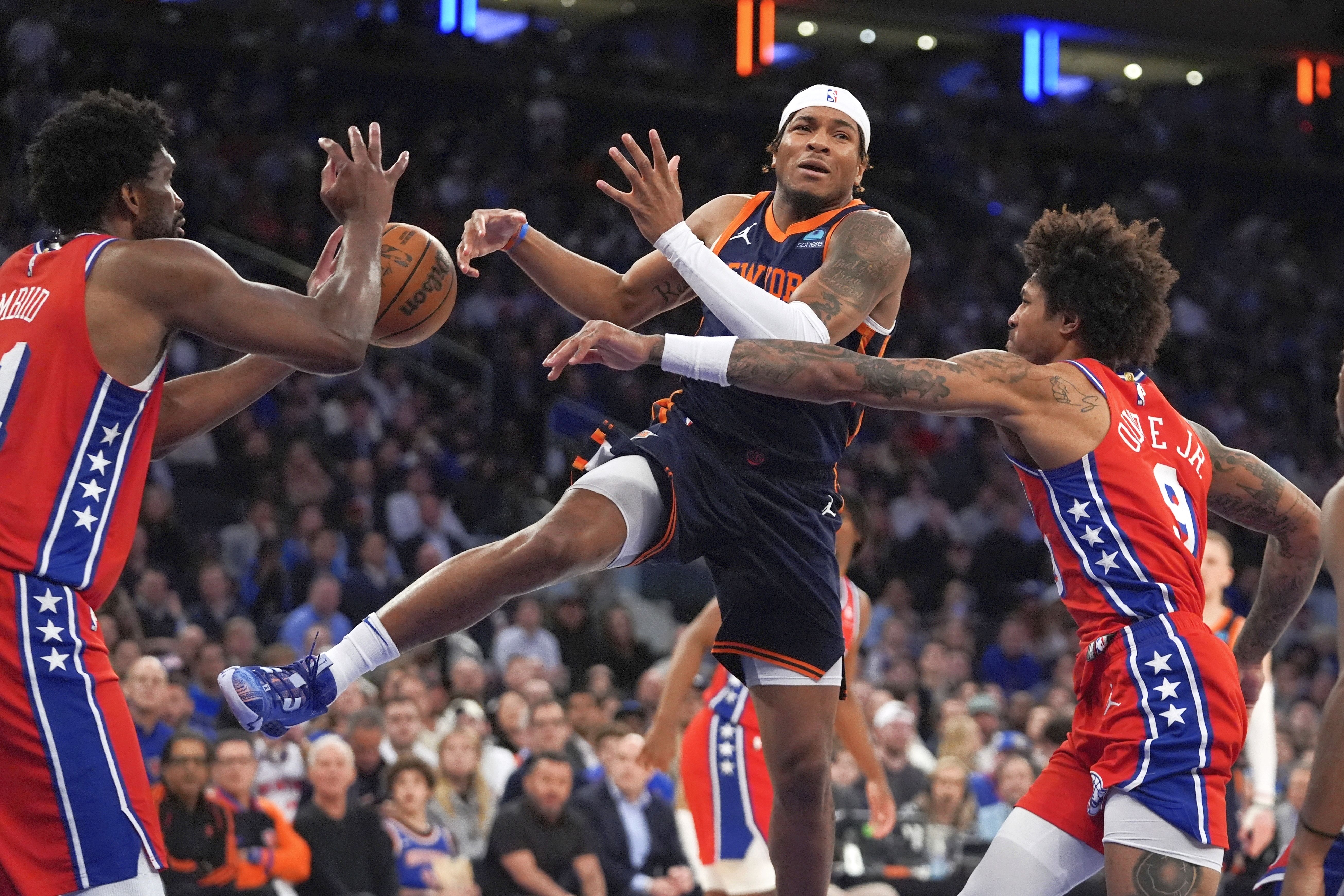 Philadelphia 76ers' Kelly Oubre Jr., right, knocks the ball away from New York Knicks' Miles McBride, center, as 76ers' Joel Embiid, left, defends during the second half of Game 2 in an NBA basketball first-round playoff series Monday, April 22, 2024, in New York. (Photo by Frank Franklin II/AP Photo)