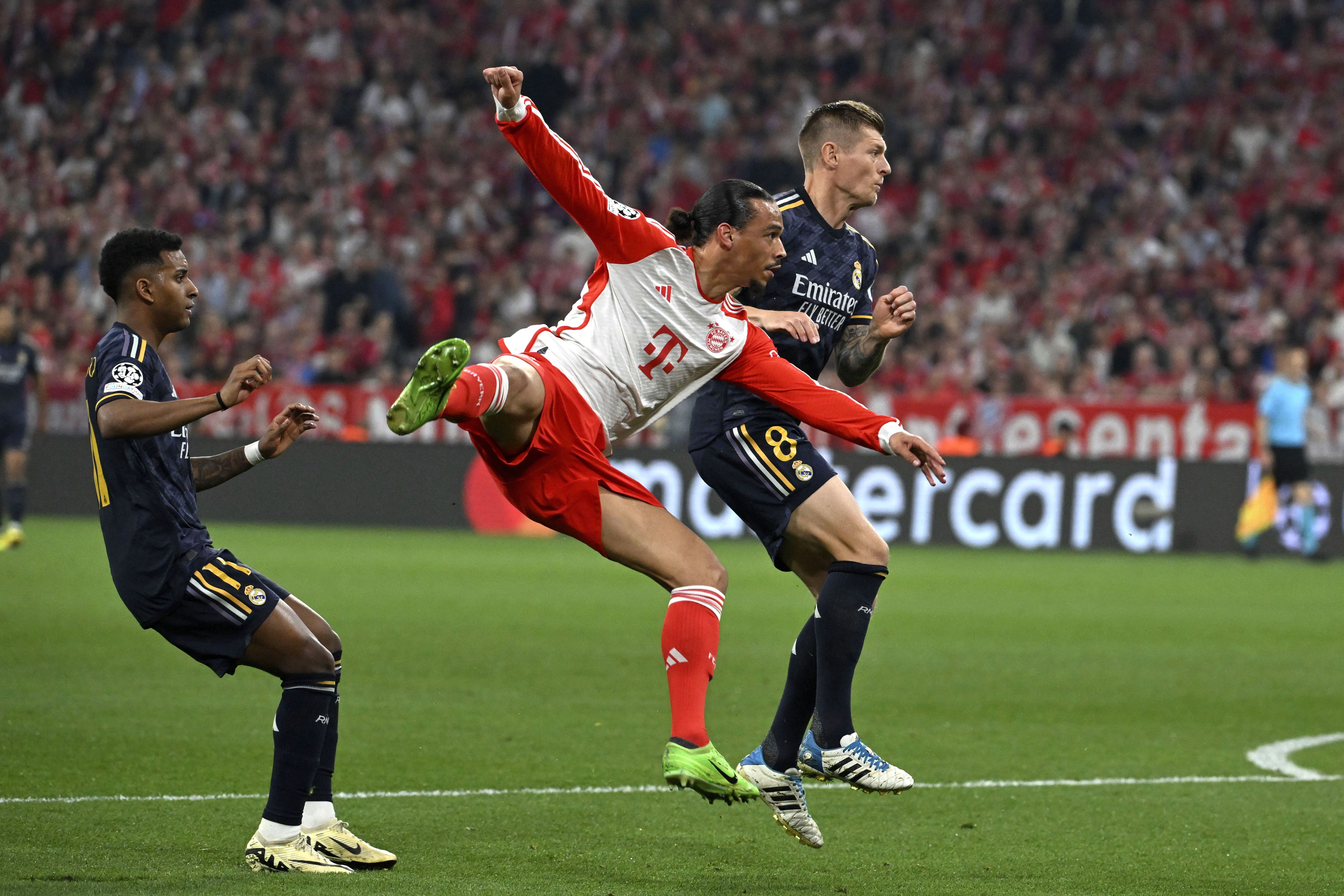 Bayern's Leroy Sane scores his side's first goal during the Champions League, semifinal first leg, soccer match between FC Bayern Munich and Real Madrid in Munich, Germany, Tuesday, April 30, 2024. (Photo by Sven Hoppe/dpa via AP Photo)
