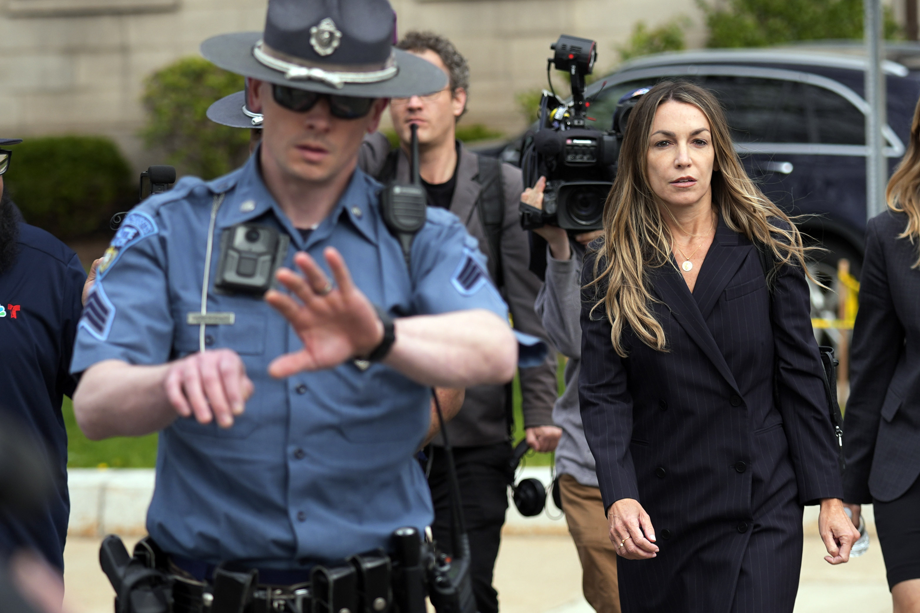 Karen Read, right, is flanked by Massachusetts State Police while leaving Norfolk Superior Court after the opening day of her trial, Monday, April 29, 2024, in Dedham, Mass. Read is charged with killing her Boston police officer boyfriend by intentionally driving her SUV into him. (Photo by Charles Krupa/AP Photo)