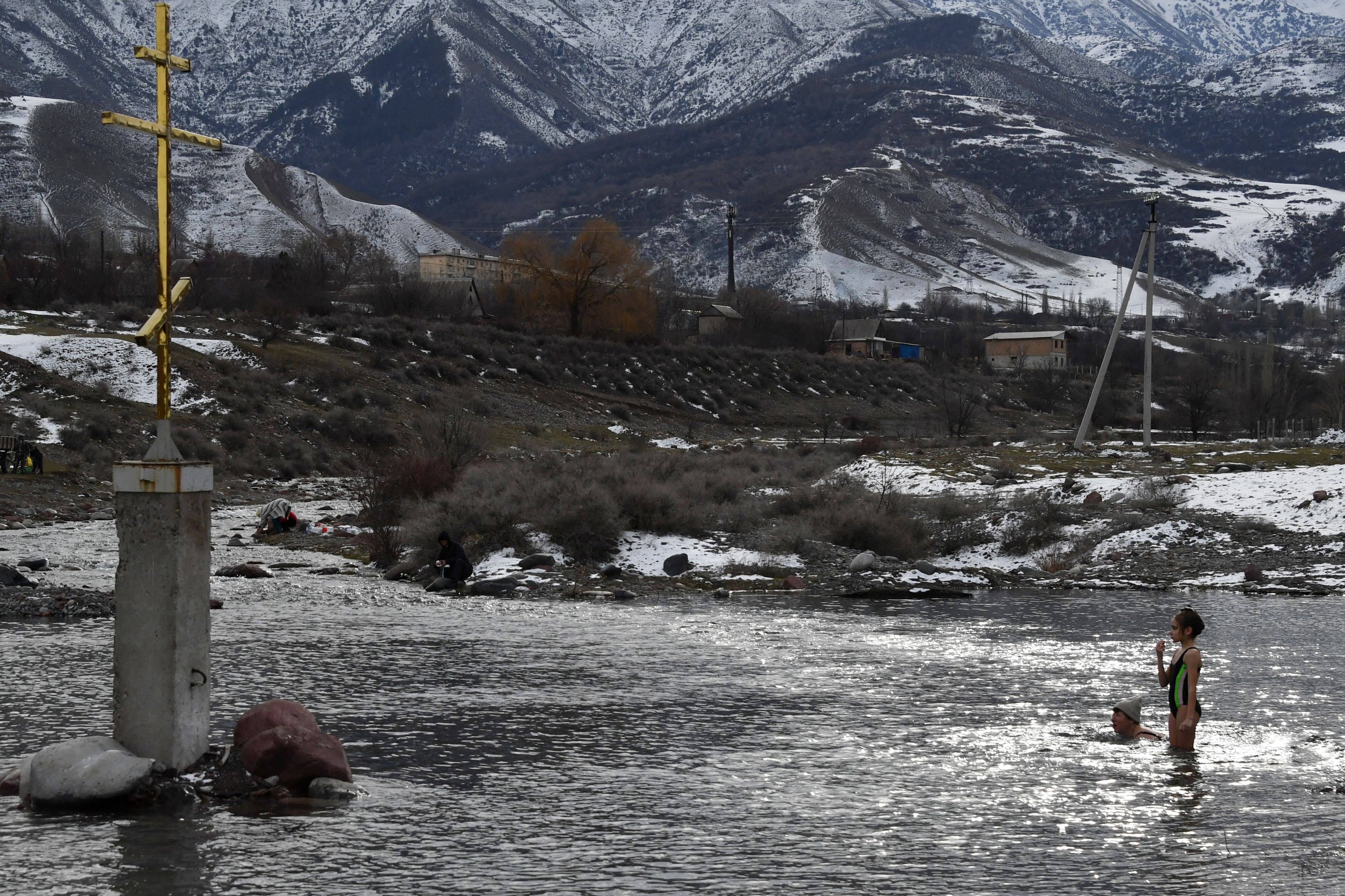 Orthodox believers plunge into the icy waters of the Kara-Balta river during the celebration of the Epiphany holiday near the village of Sosnovka, some 90 kms from Bishkek, on January 19, 2024. Among Orthodox Christians, the feast of Epiphany celebrates the day the spirit of God descended upon believers in the shape of a dove during Jesus Christ's baptism in the river Jordan. (Photo by Vyacheslav Oseledko/AFP Photo)