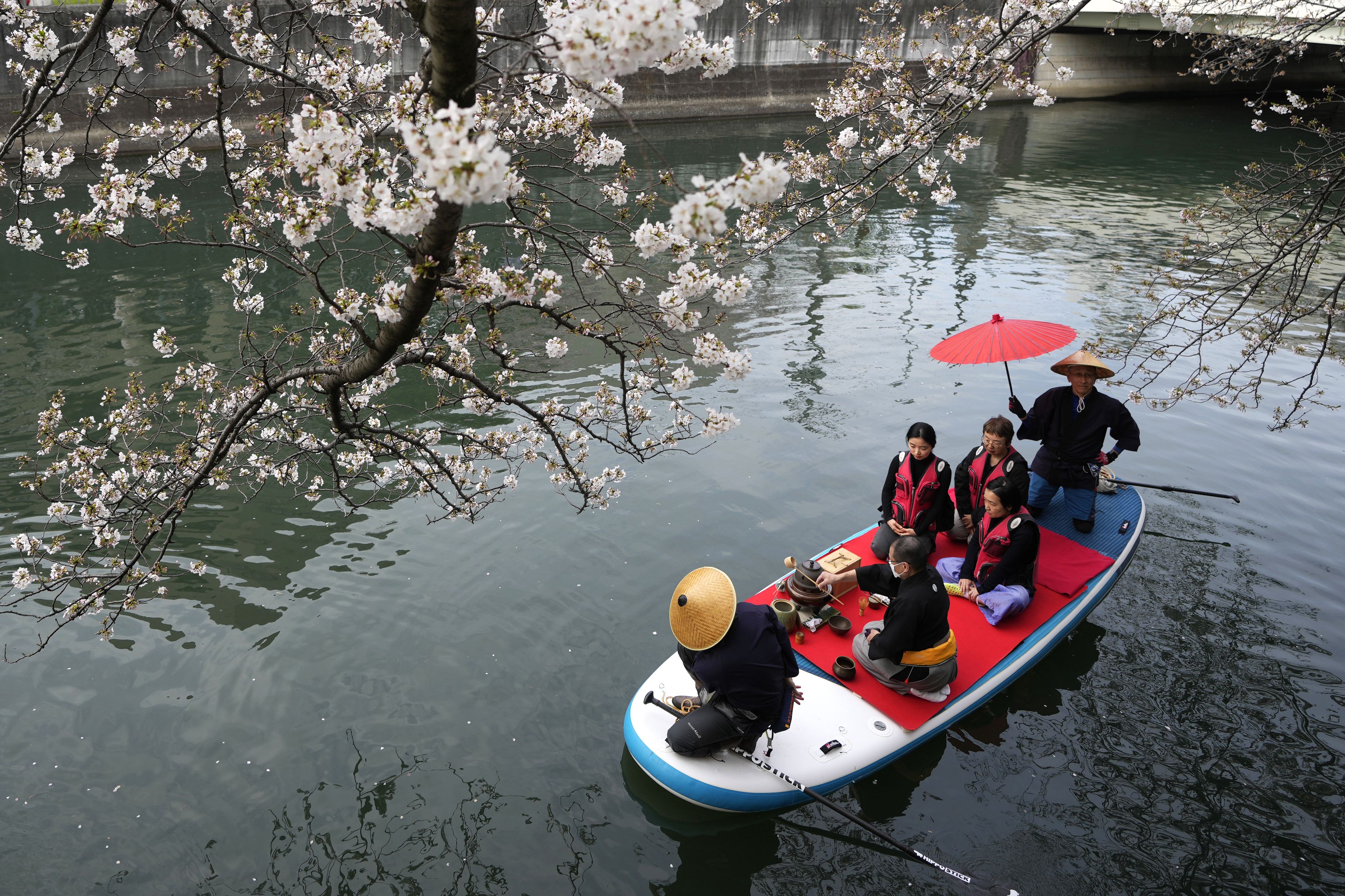 People on a boat enjoy a Japanese tea ceremony under the cherry blossoms, in a river of Yokohama, near Tokyo, Saturday, April 6, 2024. (Photo by Shuji Kajiyama/AP Photo)