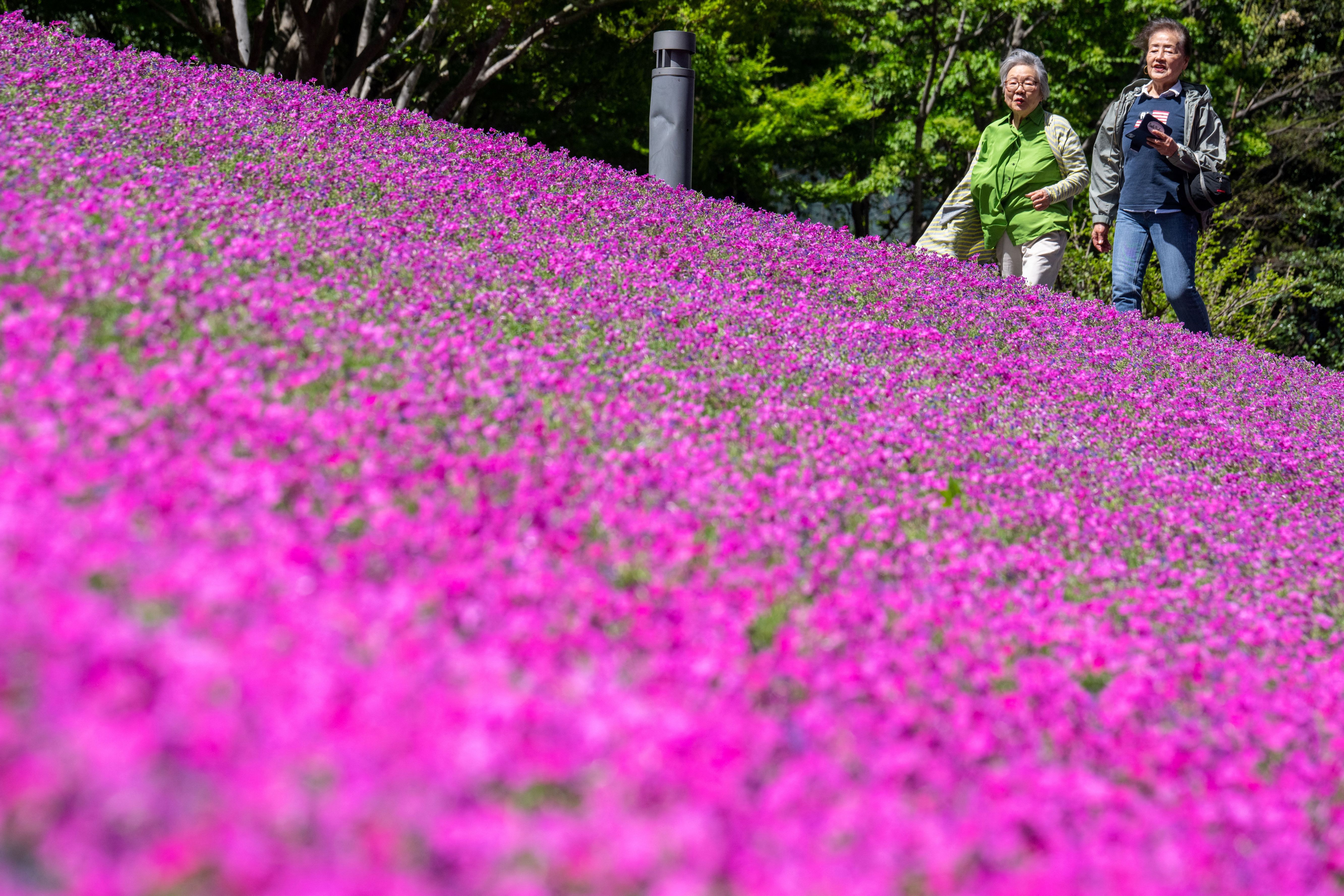 People visit a moss phlox garden in Tokyo on April 19, 2024. (Photo by Yuichi Yamazaki/AFP Photo)