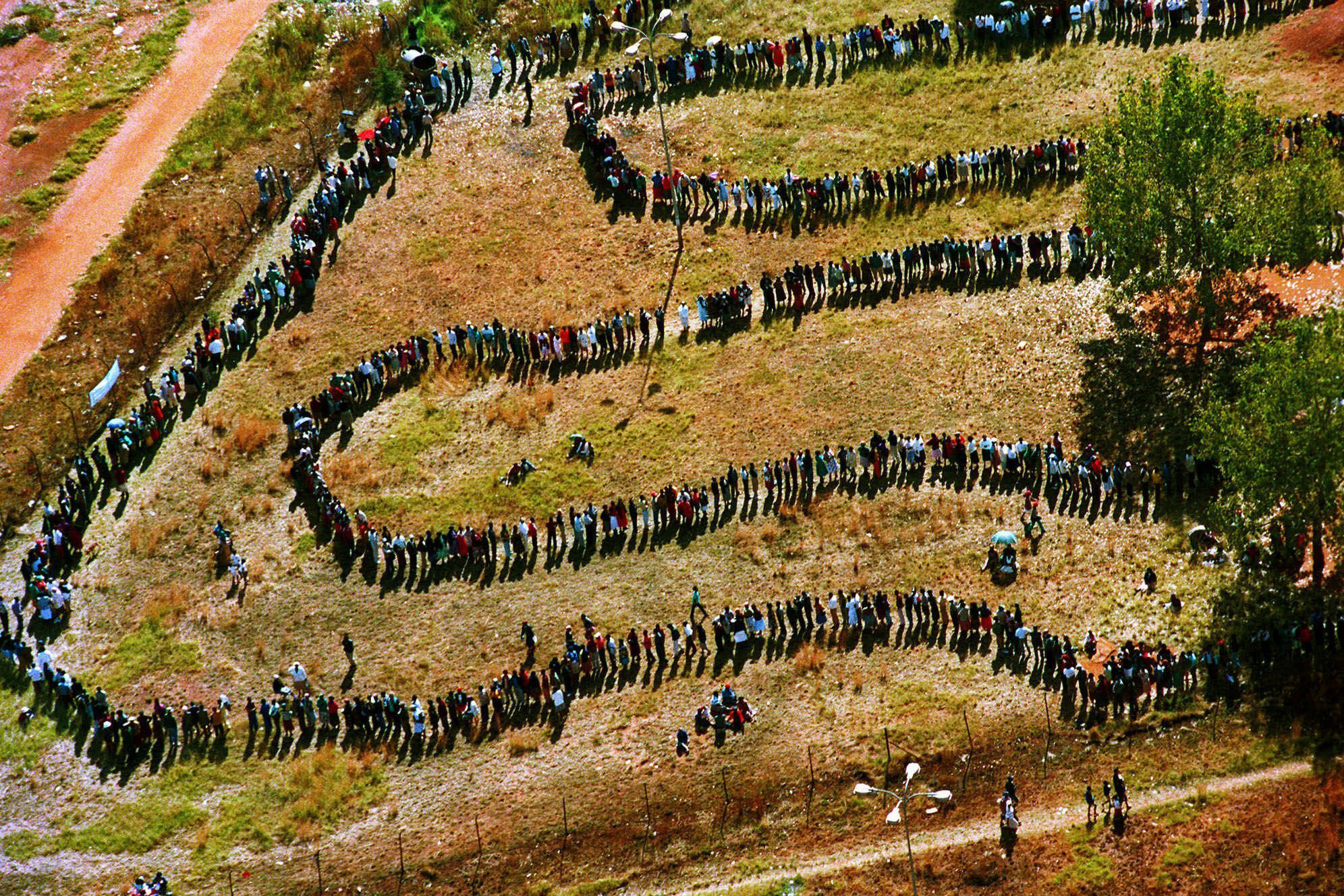 People queue to cast their votes In Soweto, South Africa April 27, 1994, in the country's first all-race elections. In 1994 people braved long queues to cast a vote after years of white minority rule which denied Black South Africans the vote. (Photo by Denis Farrell/AP Photo)