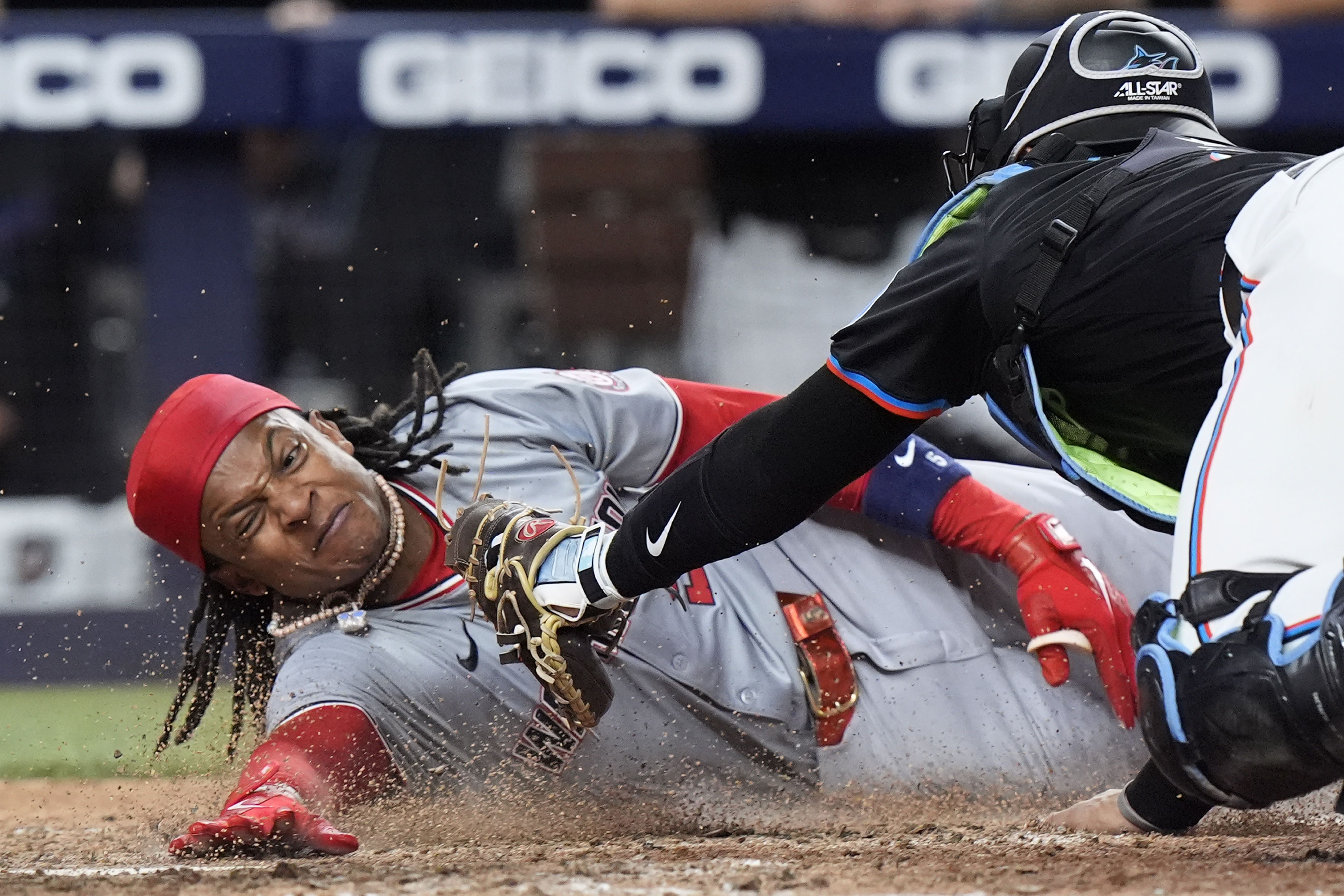 Miami Marlins catcher Nick Fortes, right, is unable to tag out Washington Nationals' CJ Abrams as he scores during the eighth inning of a baseball game, Friday, April 26, 2024, in Miami. Abrams and Trey Lipscomb scored on a single by Joey Meneses. (Photo by Wilfredo Lee/AP Photo)