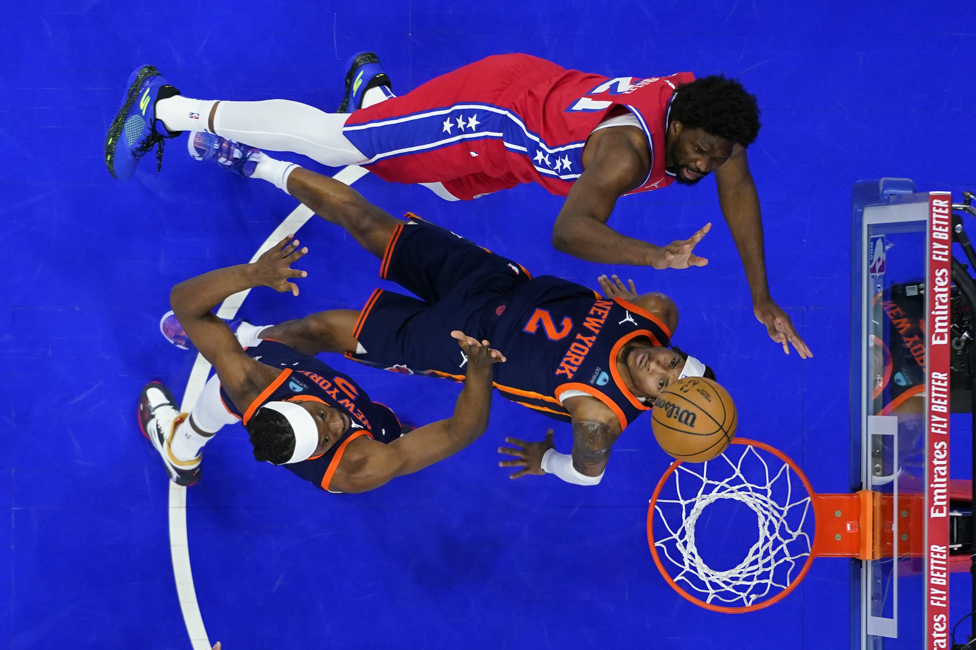 Philadelphia 76ers' Joel Embiid, top, goes up for a shot against New York Knicks' Miles McBride, center, and Precious Achiuwa during the first half of Game 4 in an NBA basketball first-round playoff series, Sunday, April 28, 2024, in Philadelphia. (Photo by Matt Slocum/AP Photo)