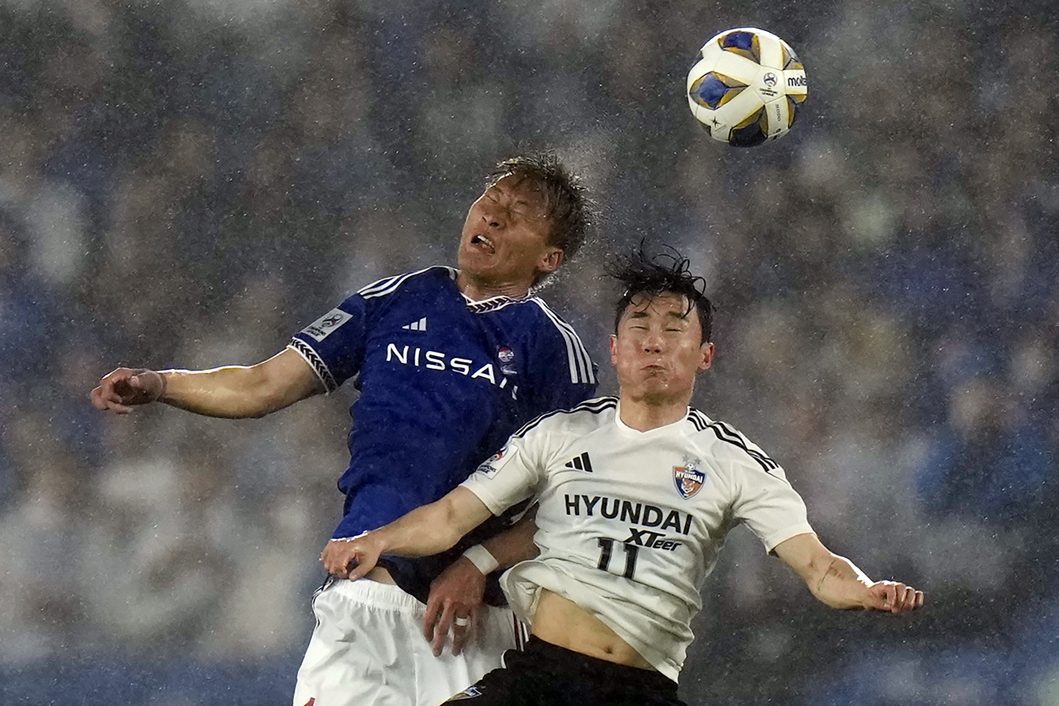 Yokohama F. Marinos' Shinnosuke Hatanaka, left, and Ulsan Hyundai's Um Won-sang, right, compete for the ball during the second leg of the AFC Champions League semifinal soccer match between Yokohama F. Marinos and Ulsan Hyundai in Yokohama, south of Tokyo, Wednesday, April 24, 2024. (Photo by Shuji Kajiyama/AP Photo)