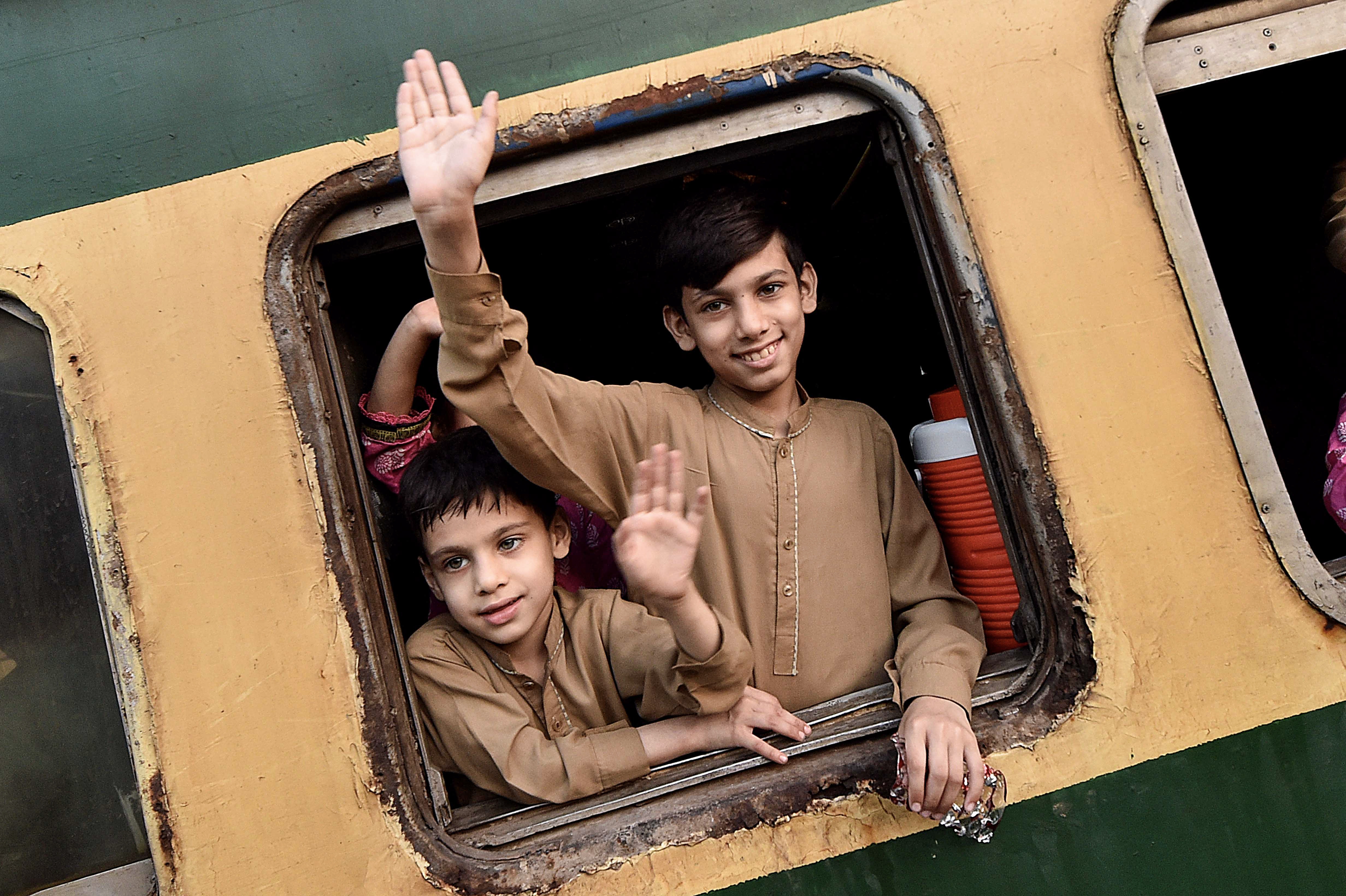 Children wave from a train's window as they prepare to travel to their homes to celebrate Eid al-Fitr, in Karachi, Pakistan, 07 April 2024. Eid al-Fitr is an Islamic holiday that marks the end of Ramadan, and is celebrated during the first three days of Shawwal, the 10th month of the Islamic calendar. It is expected to begin on 10 or 11 April 2024, depending on the lunar calendar. The Muslims' holy month of Ramadan is the ninth month in the Islamic calendar and it is believed that the revelation of the first verse in the Koran was during its last 10 nights. It is celebrated yearly by praying during the night time and abstaining from eating, drinking, and sexual acts during the period between sunrise and sunset. It is also a time for socializing, mainly in the evening after breaking the fast and a shift of all activities to late in the day in most countries. (Photo by Shahzaib Akber/EPA)