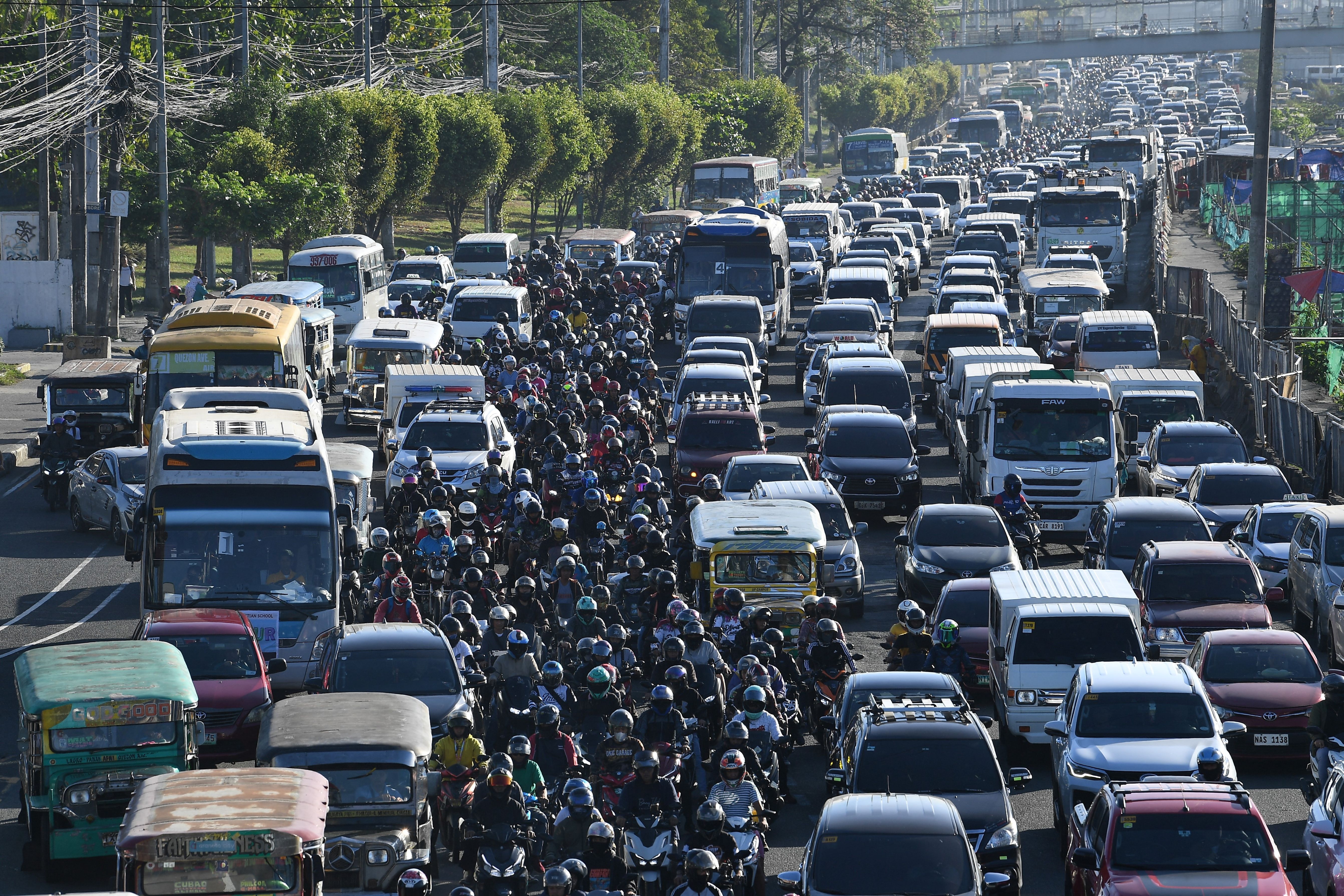Motorcycles along with other vehicles manoeuver through a heavy traffic along a road in Manila on April 5, 2024. (Photo by Ted Aljibe/AFP Photo)