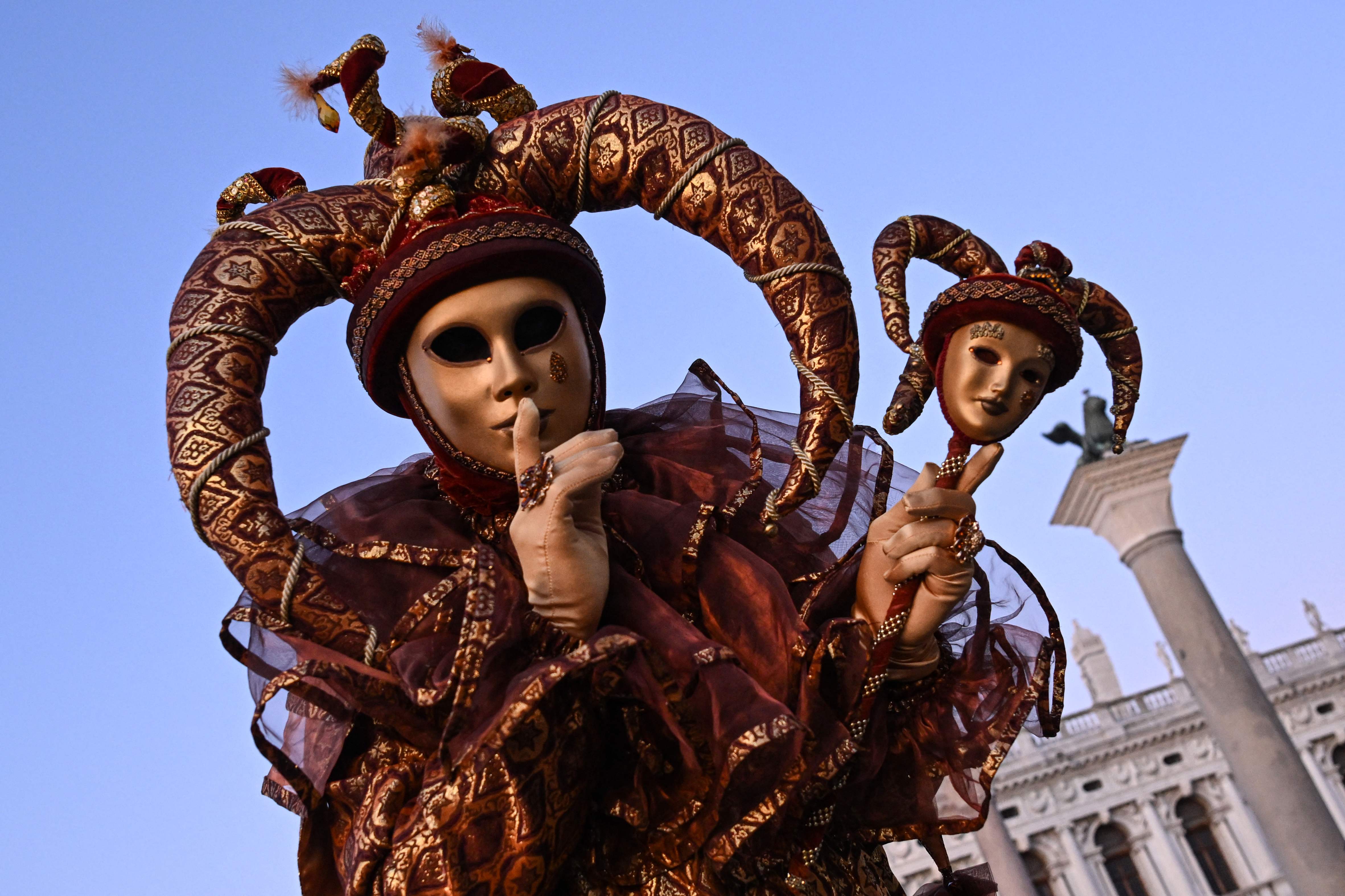 A masked reveller wearing traditional carnival costumes poses during the carnival in Venice on February 11, 2023. (Photo by Miguel Medina/AFP Photo)