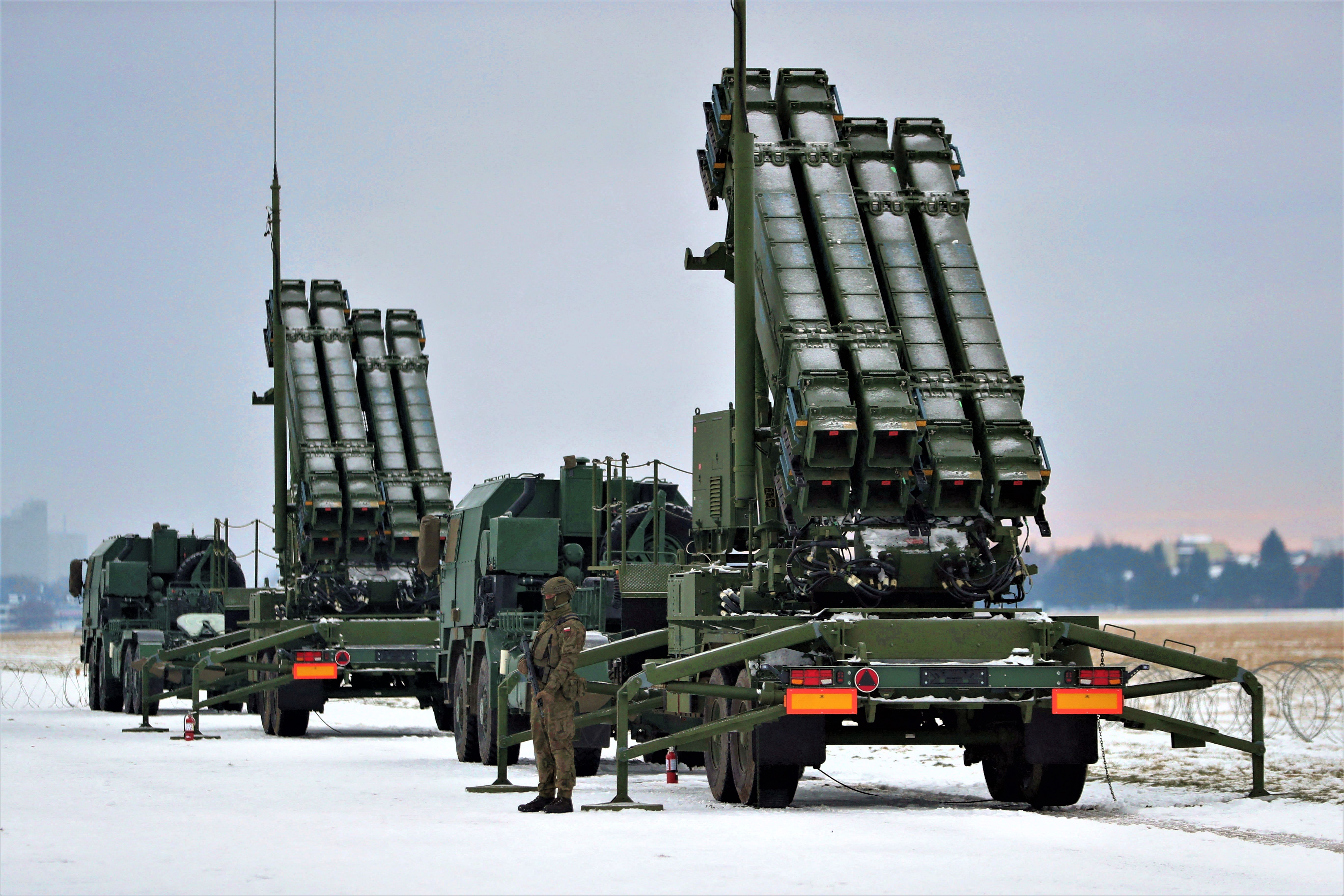 Serviceman patrols in front of the Patriot air defence system during Polish military training on the missile systems at the airport in Warsaw, Poland on February 7, 2023. (Photo by Kacper Pempel/Reuters)