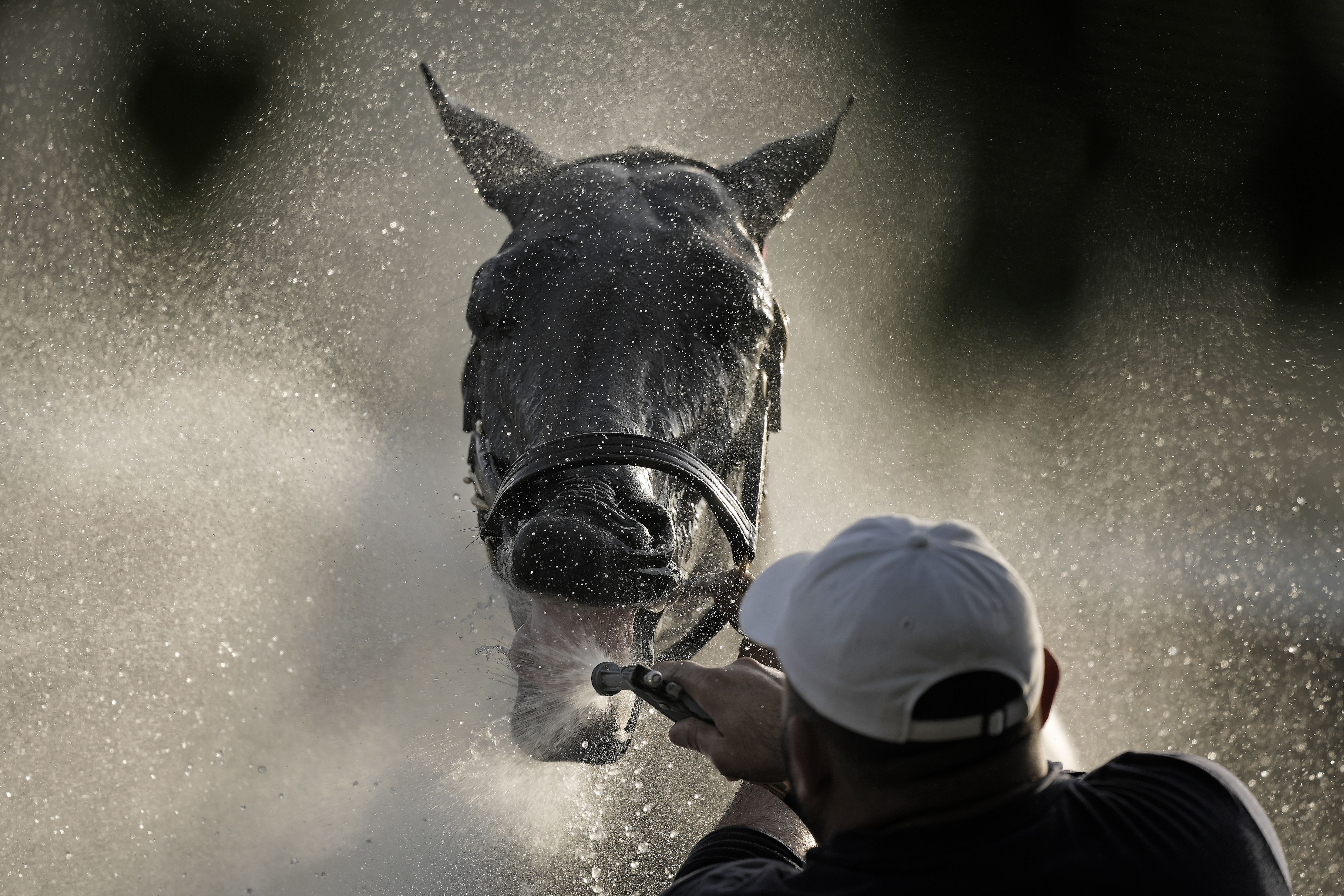 Kentucky Derby entrant Grand Mo The First gets a bath after a workout at Churchill Downs Thursday, May 2, 2024, in Louisville, Ky. The 150th running of the Kentucky Derby is scheduled for Saturday, May 4. (Photo by Charlie Riedel/AP Photo)
