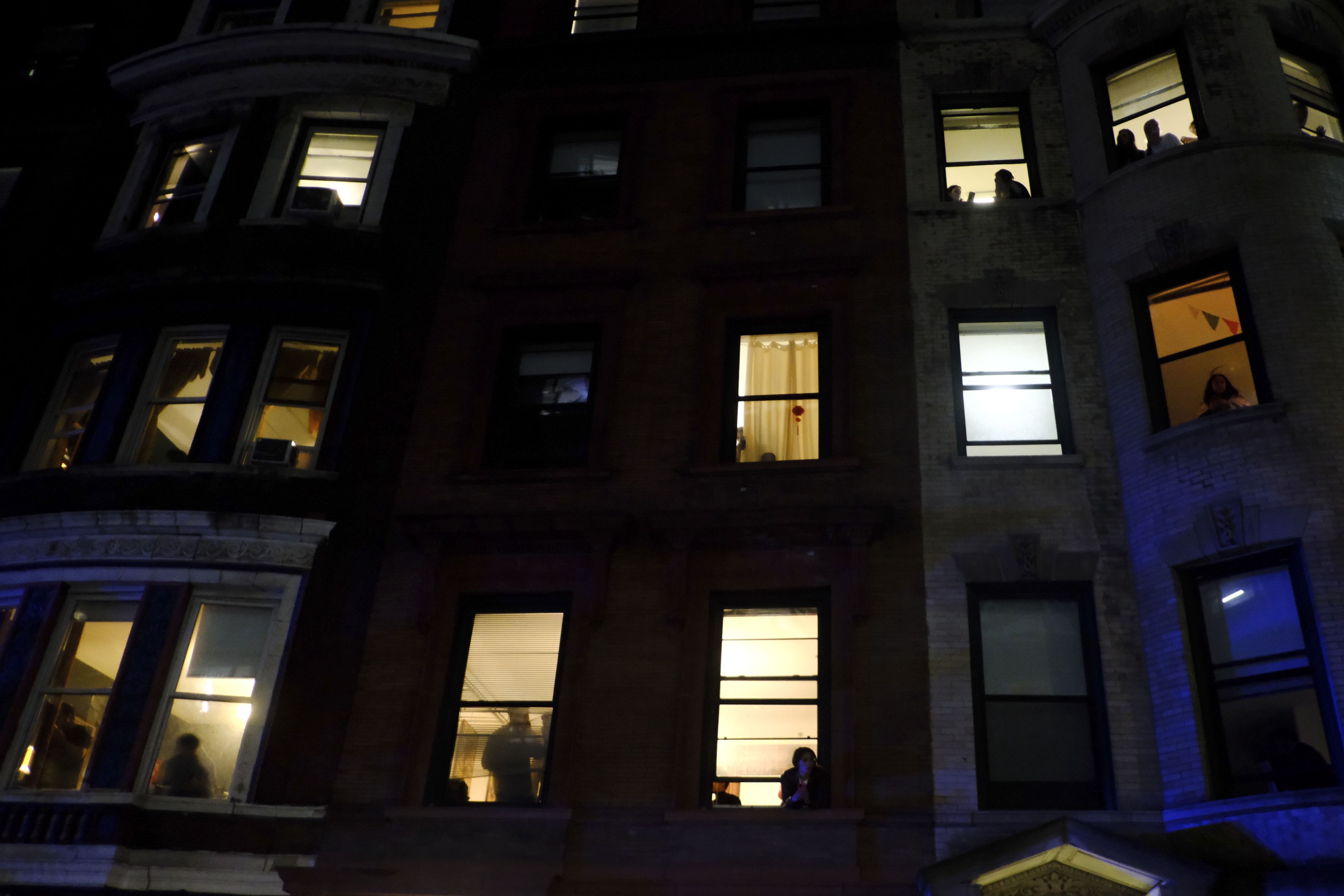 Students watch from their residence hall windows as members of the New York Police Department strategic response team move towards an entrance to Columbia University, Tuesday, April 30, 2024, in New York. After entering the campus, a contingent of police officers approached Hamilton Hall, the administration building that student protesters began occupying in the morning. (Photo by Julius Motal/AP Photo)