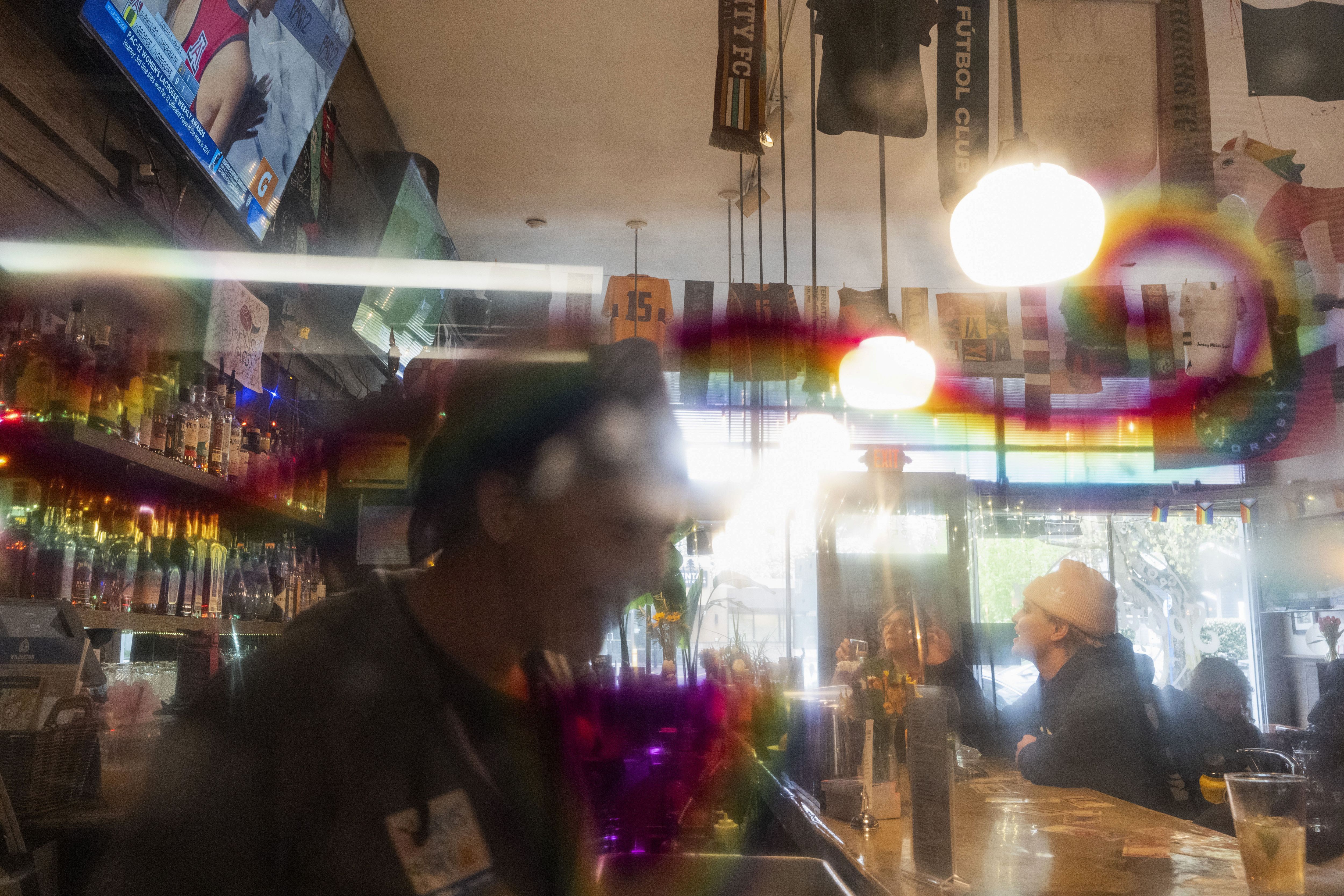With a rainbow mustache drawn on a porthole door connecting the kitchen and bar, patrons watch a beach volleyball match on big-screen TV at The Sports Bra sports bar in Portland, Ore., April 24, 2024. (Photo by Jenny Kane/AP Photo)