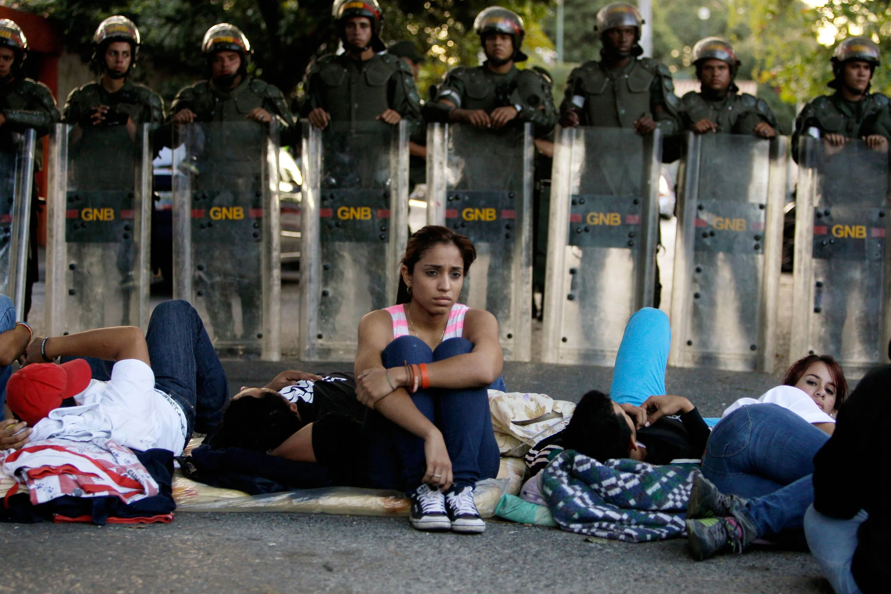 Students sit on the street outside Cuba's embassy to demand information about the health of Venezuela's President Hugo Chavez in Caracas, Venezuela, Thursday, February 14, 2013. The government has not given details about what sort of treatments Chavez is now undergoing in Havana, more than two months after his fourth cancer-related surgery on December 11. (Photo by Fernando Llano/AP Photo)