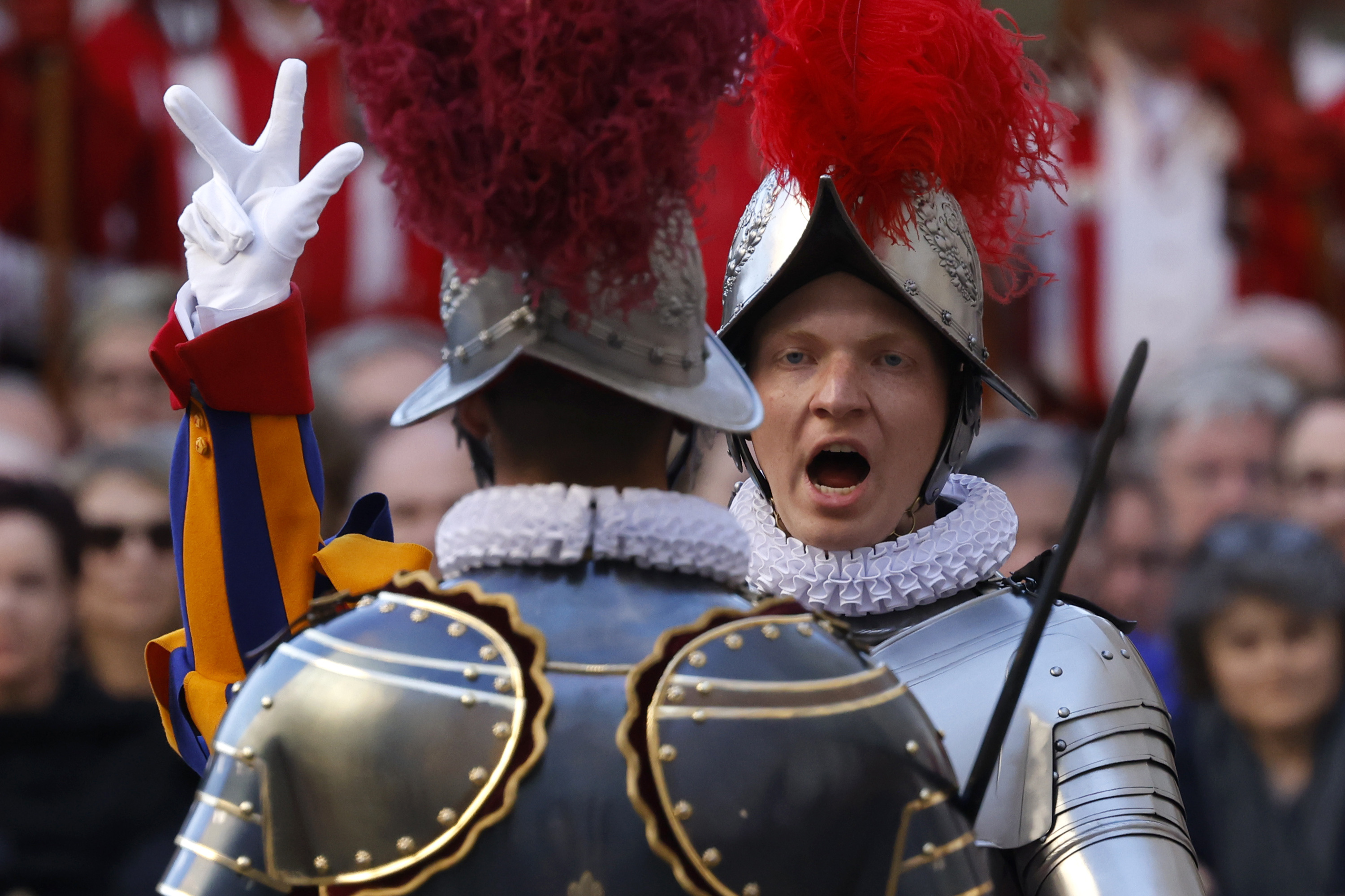 A Vatican Swiss Guard new recruit attends the swearing-in ceremony at the Vatican, on May 06, 2024. 34 Swiss Guard new recruits swore allegiance to Pope Francis and his successors during a ceremony held in St. Damaso courtyard on May 6, recalling the death of 147 of their predecessors defending Pope Clement VII during the Sack of Rome by Holy Roman Emperor Charles army in 1527. (Photo by Riccardo De Luca/Anadolu via Getty Images)
