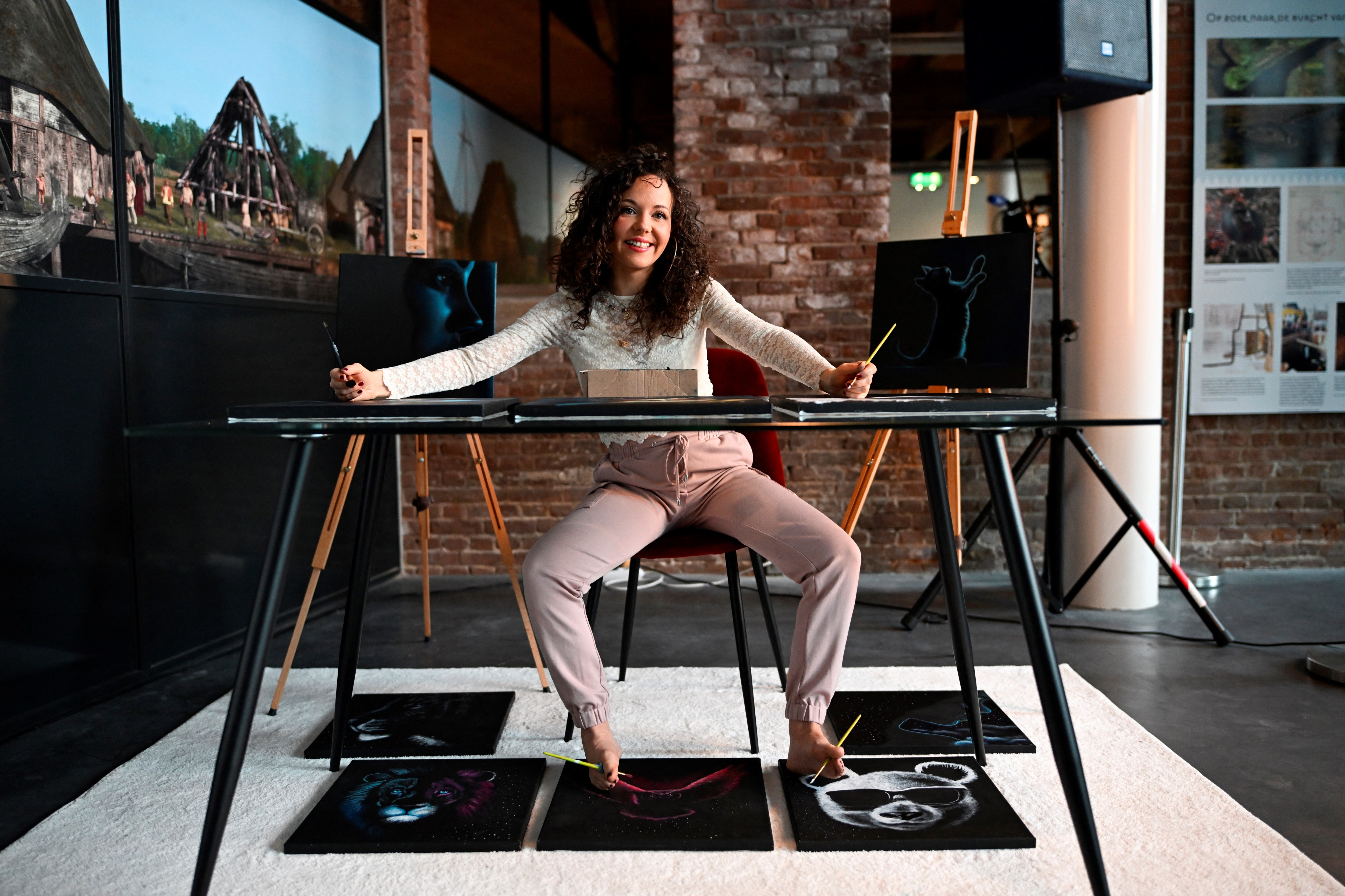 Dutch artist Rajacenna van Dam, paints ten paintings at once with both hands and feet, live in a museum in Vlaardingen, Netherlands on May 3, 2024. (Photo by John Thys/AFP Photo)