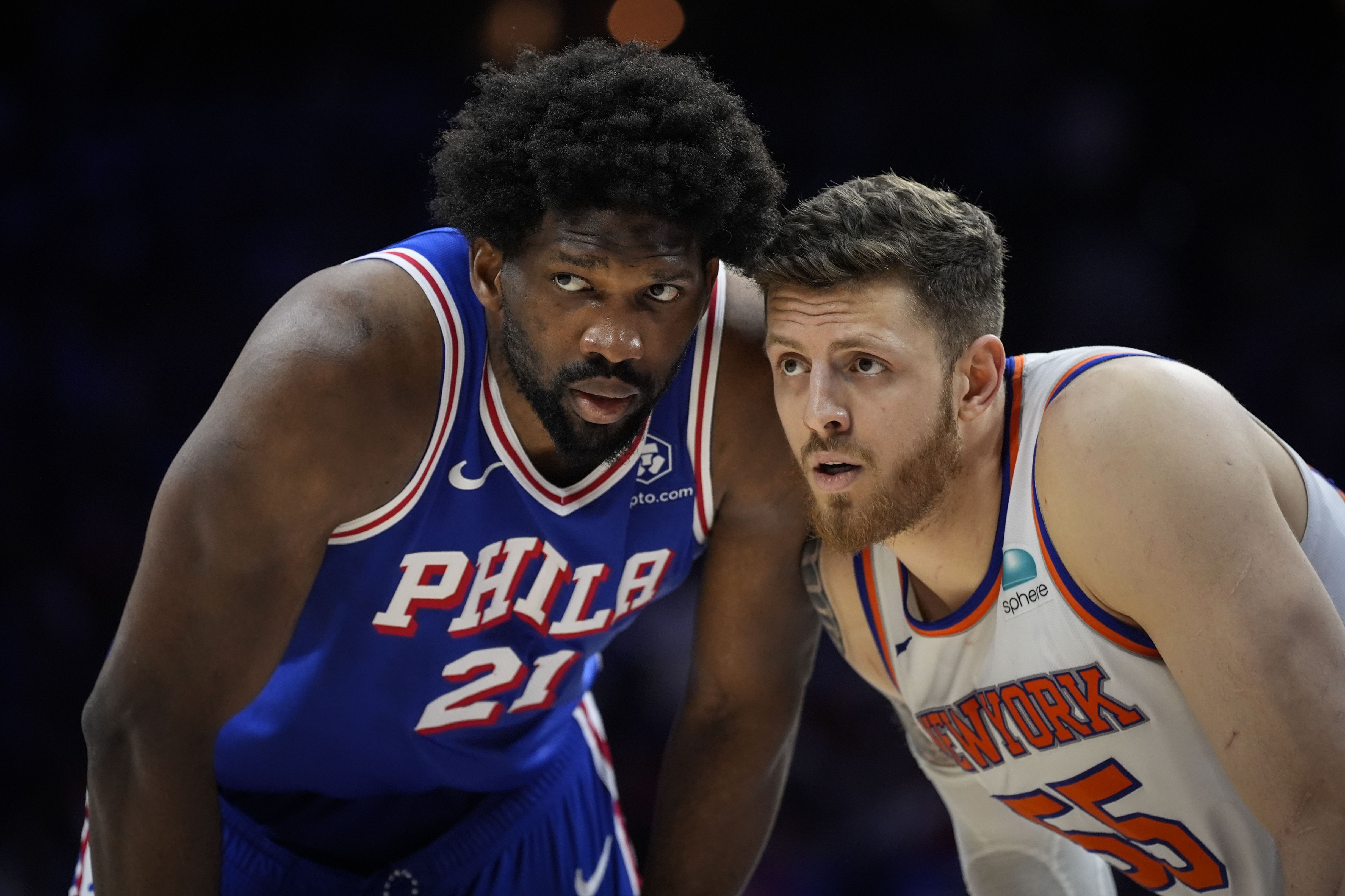 Philadelphia 76ers' Joel Embiid, left, and New York Knicks' Isaiah Hartenstein, right, guard against each other during the second half of Game 6 in an NBA basketball first-round playoff series, Thursday, May 2, 2024, in Philadelphia. (Photo by Matt Slocum/AP Photo)