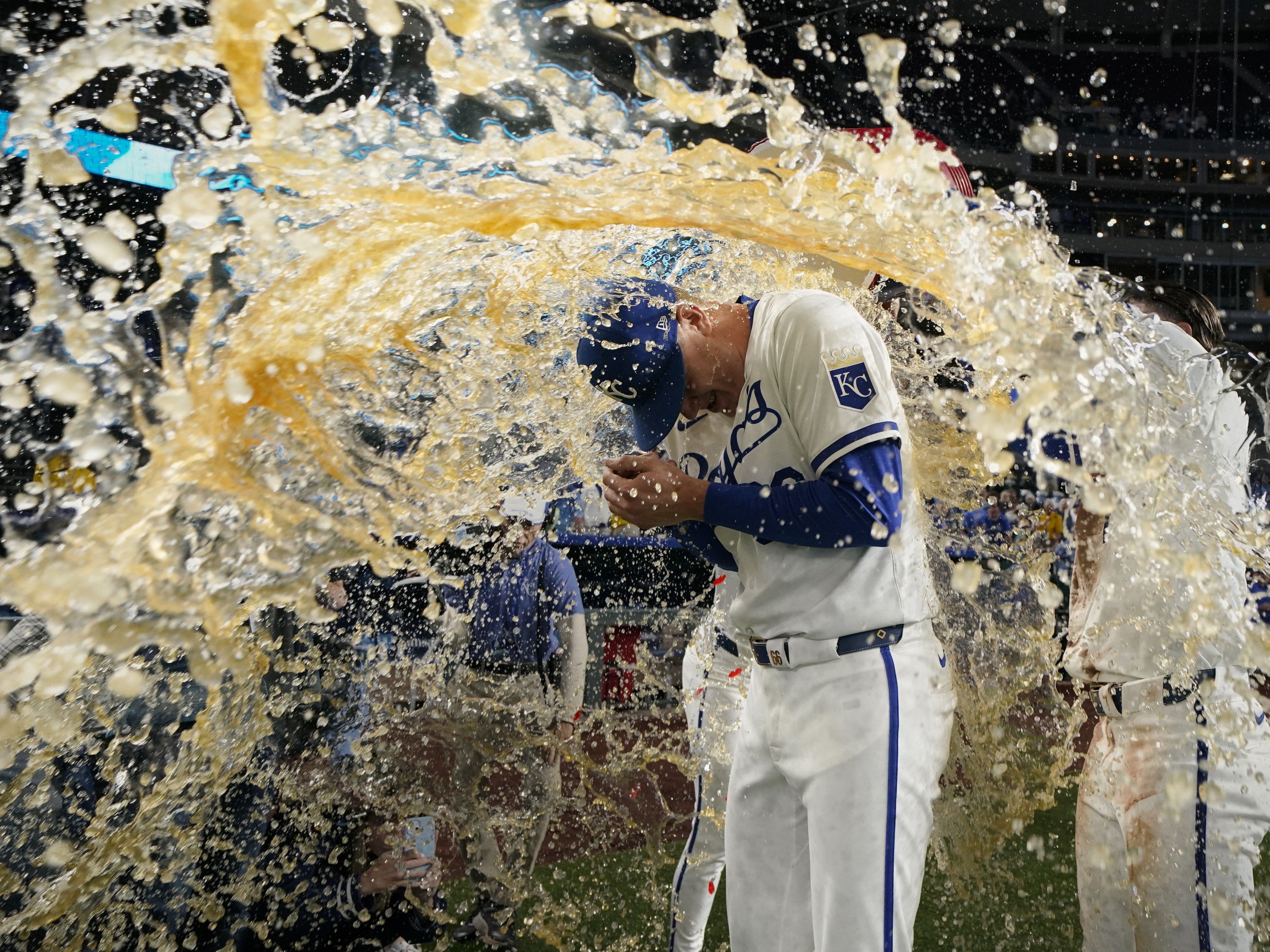 James McArthur #66 of the Kansas City Royals is doused by teammate Bobby Witt Jr. #7 after their 3-2 win over the Toronto Blue Jays at Kauffman Stadium on April 24, 2024 in Kansas City, Missouri. (Photo by Ed Zurga/Getty Images/AFP Photo)