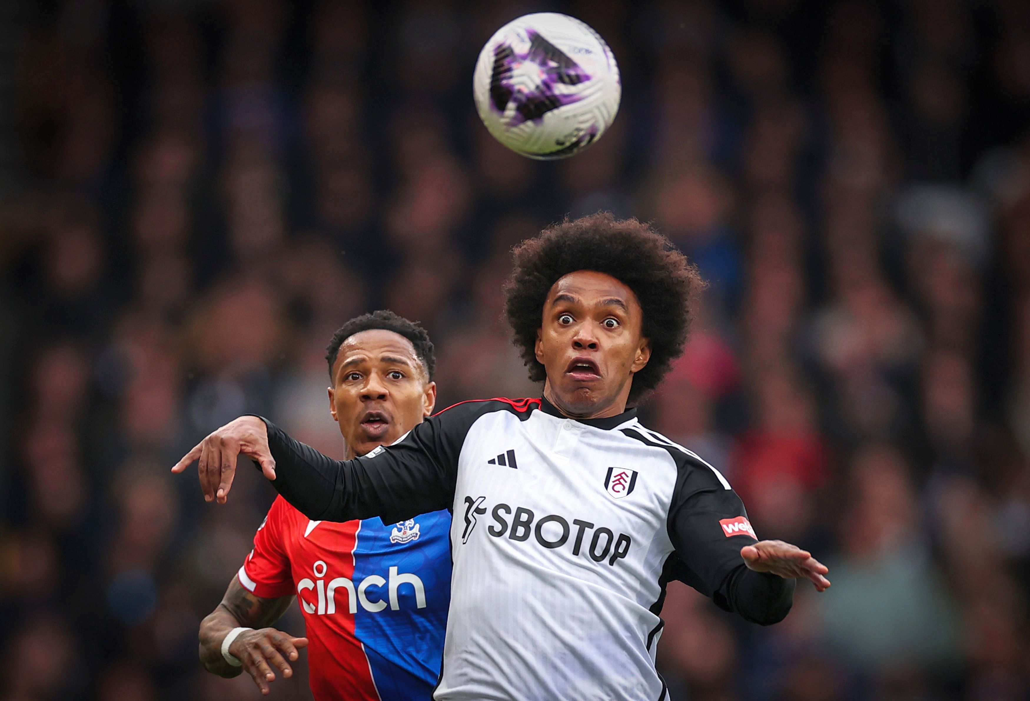 Willian of Fulham chases a loose ball under pressure from Nathaniel Clyne of Crystal Palace during the Premier League match between Fulham FC and Crystal Palace at Craven Cottage on April 27, 2024 in London, England. (Photo by Ryan Pierse/Getty Images) (Photo by Ryan Pierse/Getty Images)