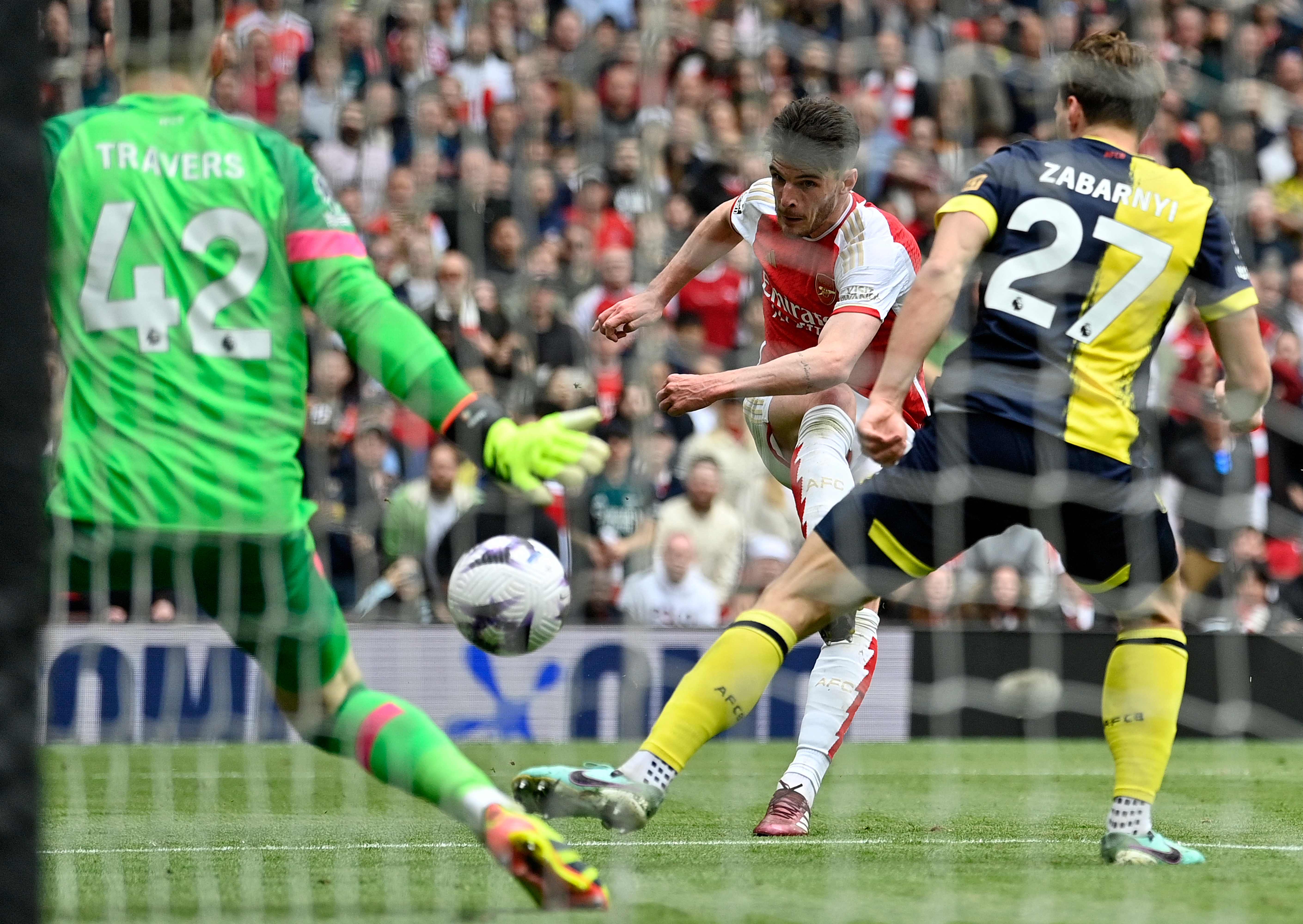Arsenal's English midfielder #41 Declan Rice scores the team's third goal during the English Premier League football match between Arsenal and Bournemouth at the Emirates Stadium, in London, on May 4, 2024. (Photo by Justin Tallis/AFP Photo)
