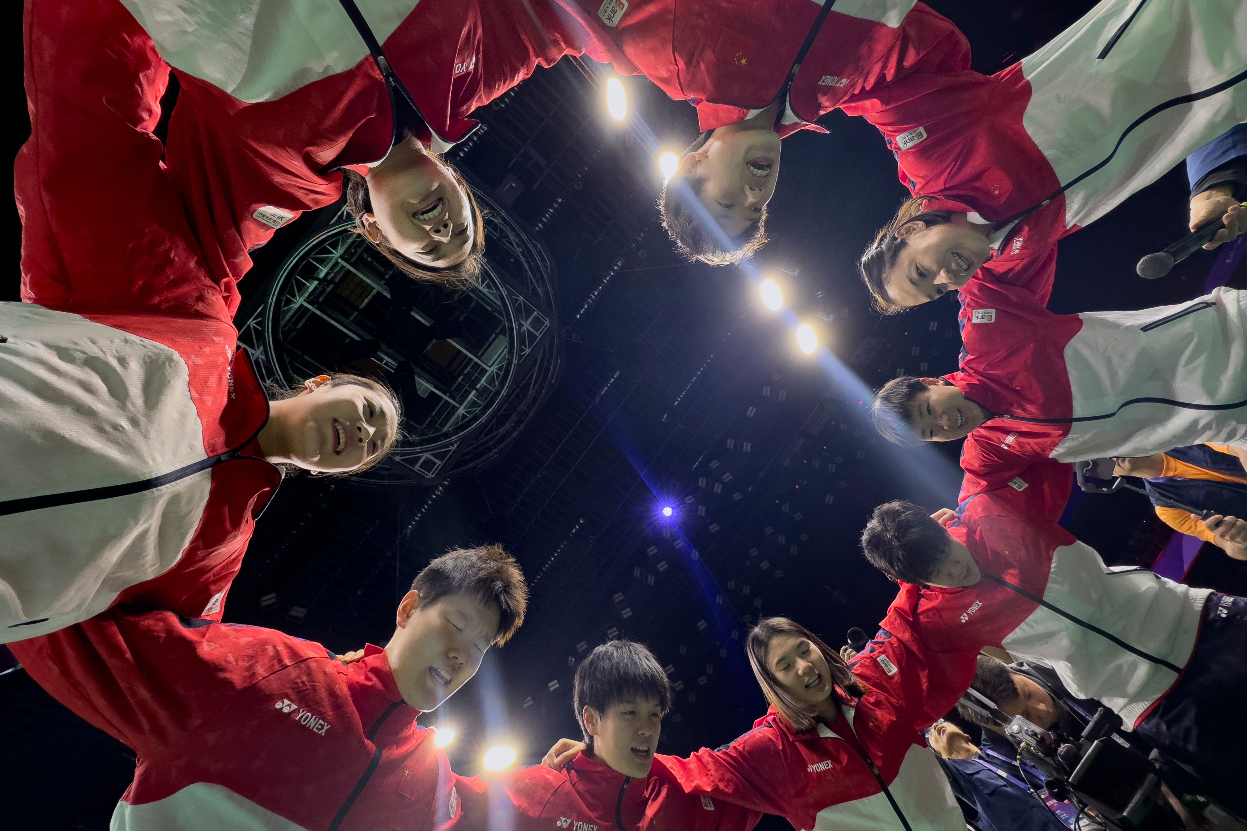 China's Women Badminton team gather for a group cheer before a final match against Indonesia for the Uber Cup held in Chengdu in southwestern China's Sichuan Province, Sunday, May 5, 2024. (Photo by Ng Han Guan/AP Photo)