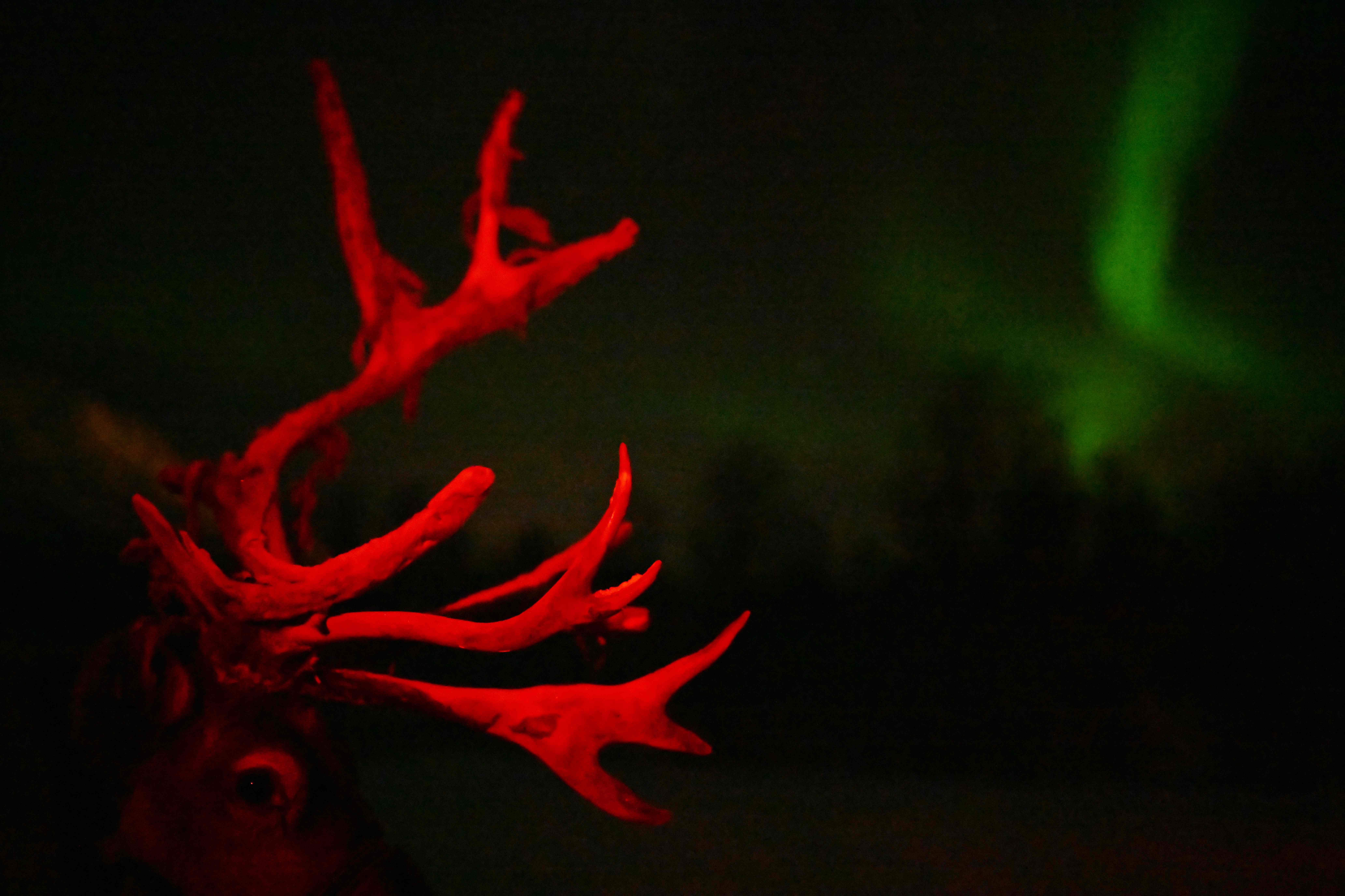 A reindeer is seen in front of the northern lights (aurora borealis) illuminating the sky above a Sami camp outside the village of Breivikeidet near Tromso, Norway, beyond the Arctic Circle on January 1, 2024. (Photo by Sergei Gapon/AFP Photo)