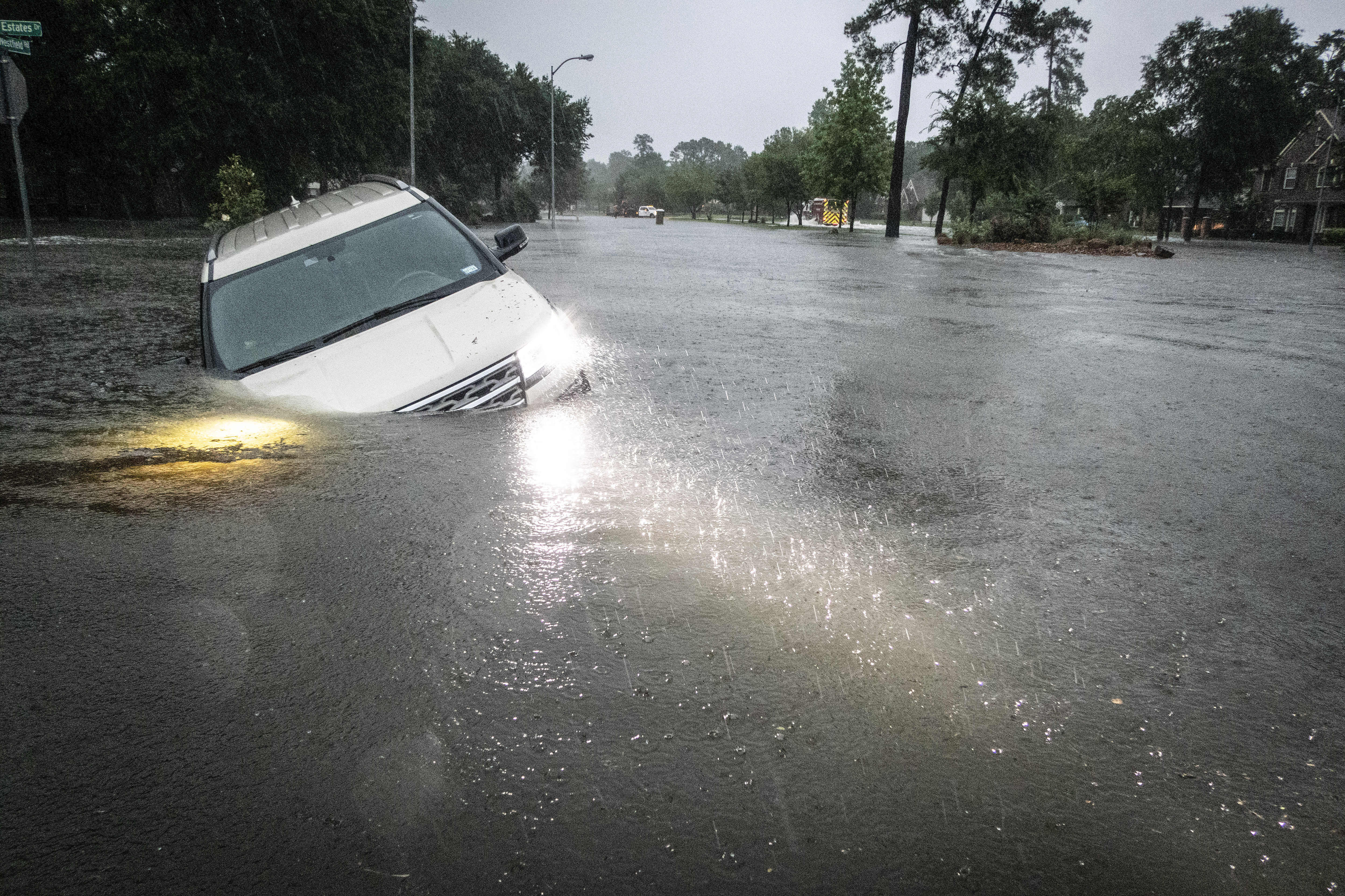 An SUV is stranded in a ditch in a stretch of street flooding during a severe storm, Thursday, May 2, 2024, in Spring, Texas. (Photo by Brett Coomer/Houston Chronicle via AP Photo)
