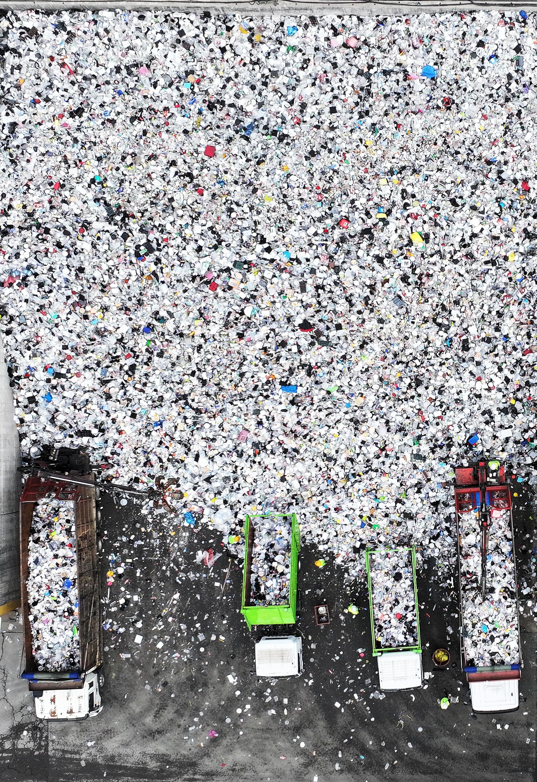 Work is under way to move piles of plastic waste at a facility that stores recyclable materials in Suwon, South Korea, 22 April 2024, Earth Day. (Photo by Yonhap/EPA)