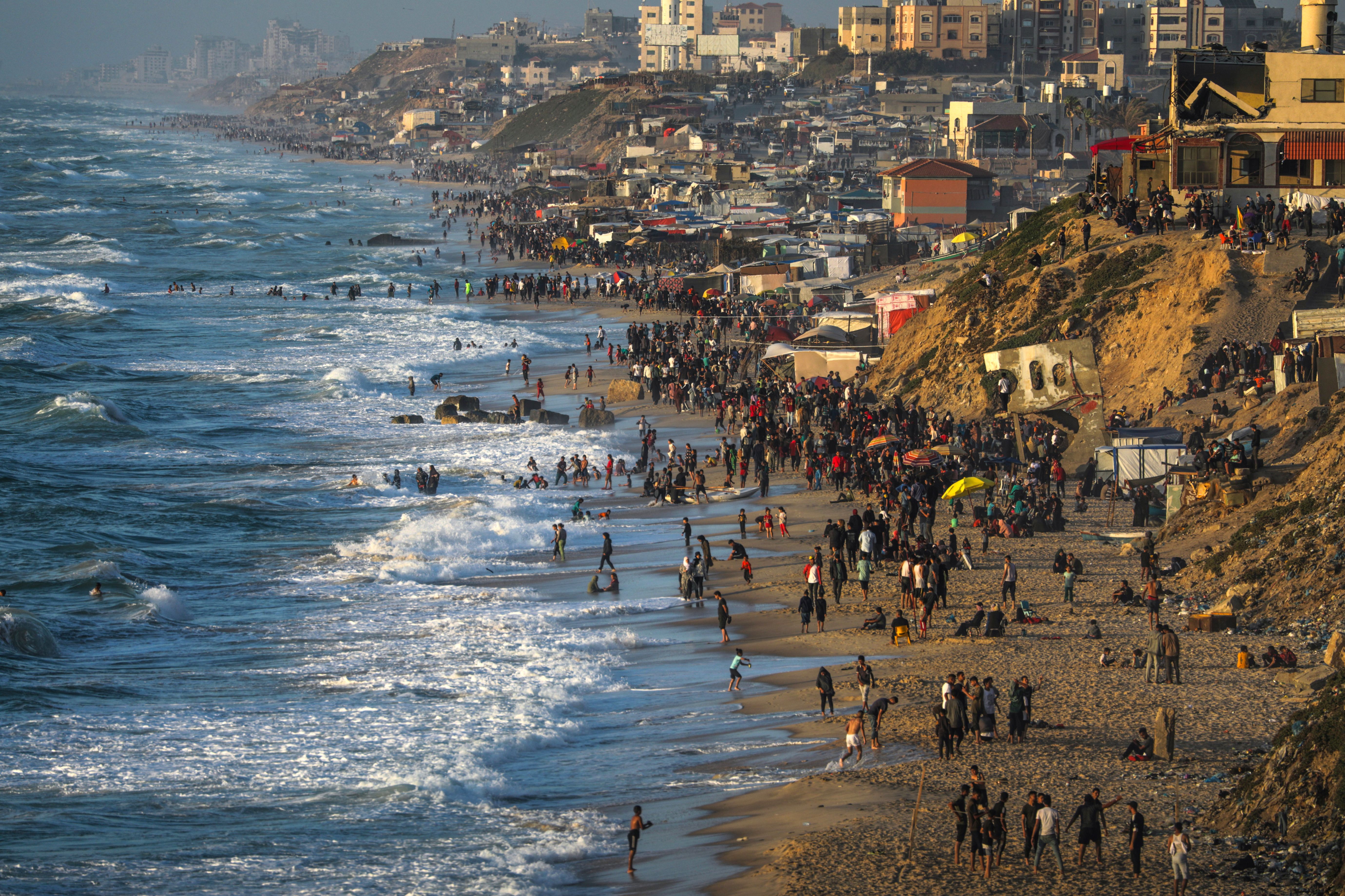 Shelters used by displaced Palestinians who fled from the northern Gaza strip at Deir Al Balah beach in the southern Gaza Strip, 03 May 2024. More than 34,550 Palestinians and over 1,455 Israelis have been killed, according to the Palestinian Health Ministry and the Israel Defense Forces (IDF), since Hamas militants launched an attack against Israel from the Gaza Strip on 07 October 2023, and the Israeli operations in Gaza and the West Bank which followed it. (Photo by Mohammed Saber/EPA)